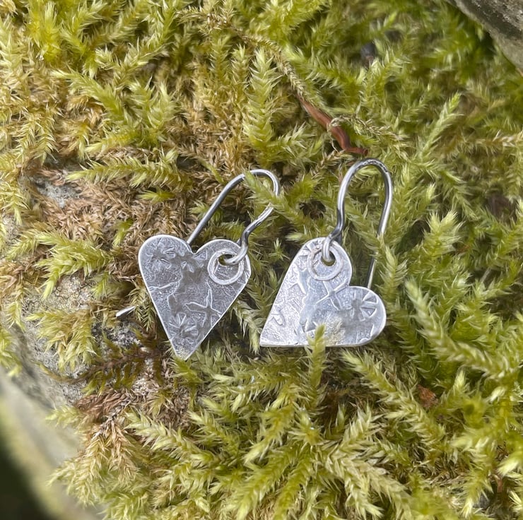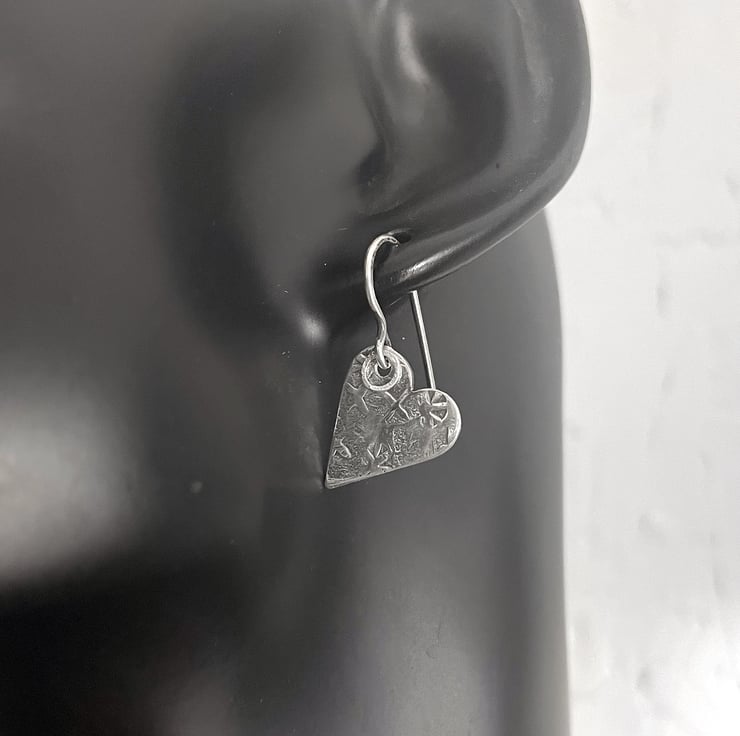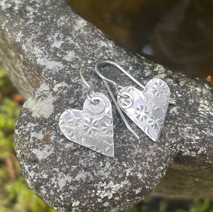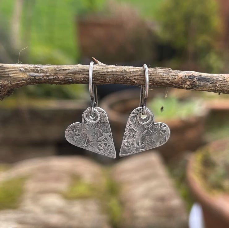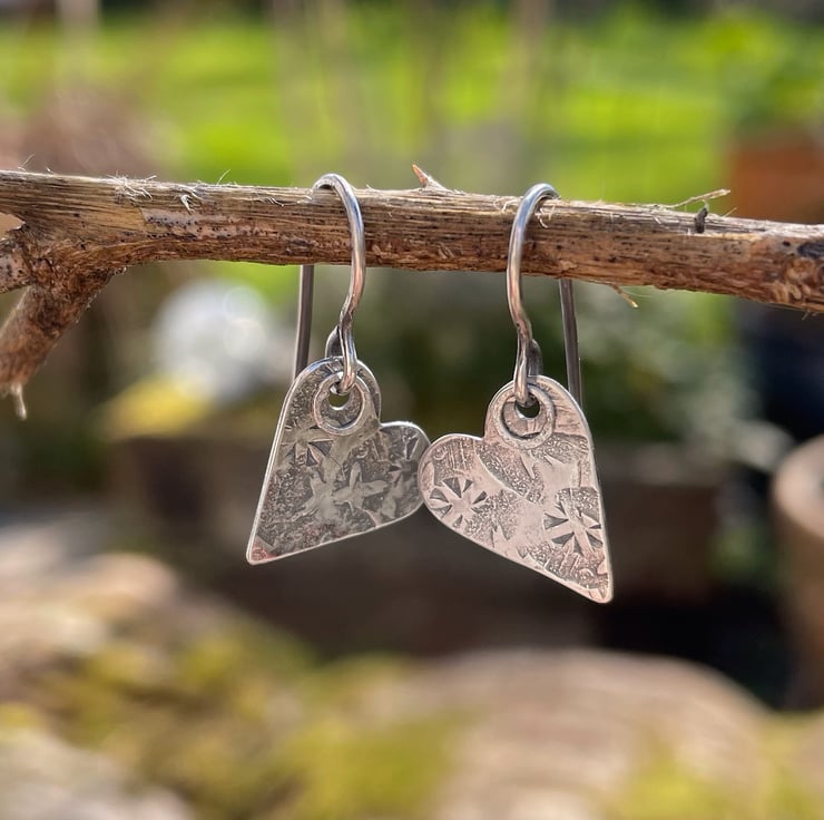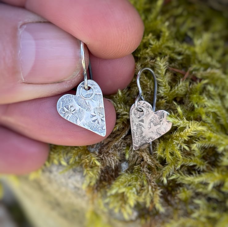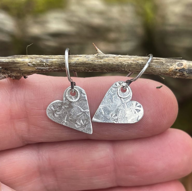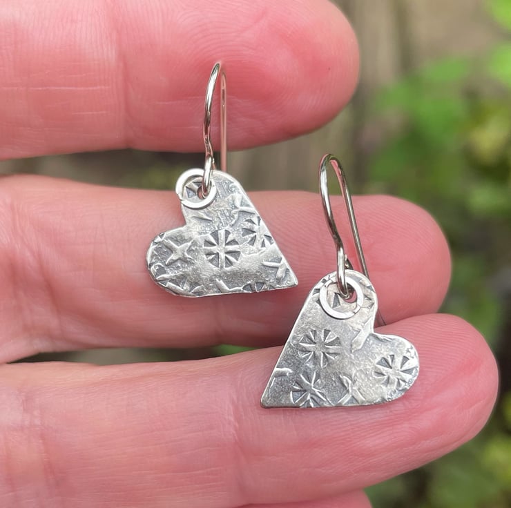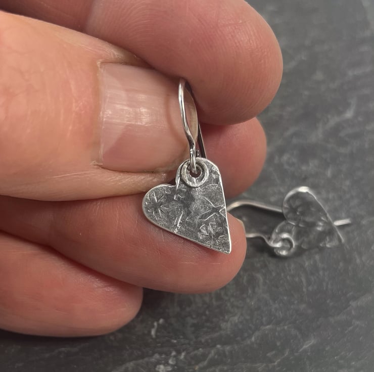 Small lightweight oxidised silver heart earrings, textured with a “firework” pattern.