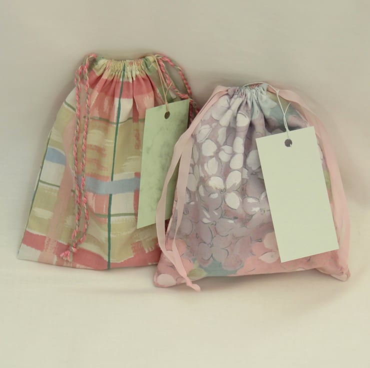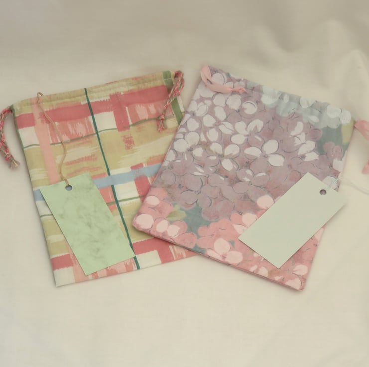 Two pretty drawstring gift bags with coordinating tags. A lovely way to present a gift and the bags can also be used for storage or small projects - see images for suggestions.