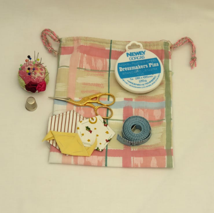 My gift bags are made from my own fabric remnants, commercial offcuts or recycled fabric from garments or household textiles. The drawstrings are made from coordinating ribbon or hand made cord (using my stash of yarns and threads - the colours chosen to ccordinate with the fabric, or a natural linen thread). These bags are not lined - the fabric is cut with pinking sheers to reduce any fraying and give a pretty finish.