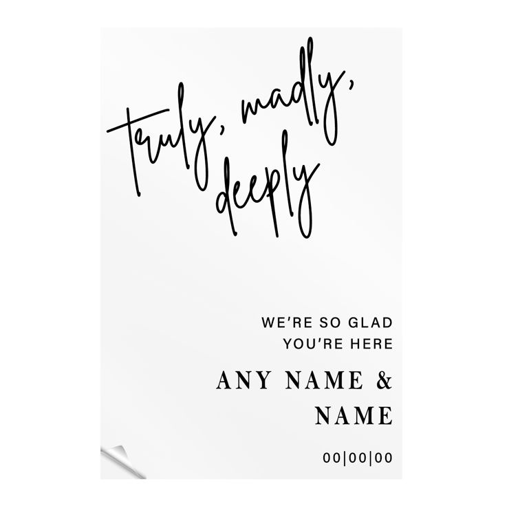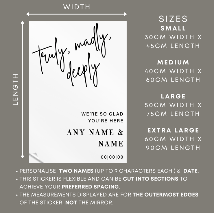 Capture the essence of your love story with our custom DIY wedding mirror decal featuring the romantic phrase "Truly, Madly, Deeply." This elegant decal is perfect for adding a heartfelt touch to mirrors, signs, or any smooth surface at your wedding venue, creating a memorable and enchanting atmosphere.