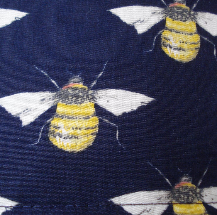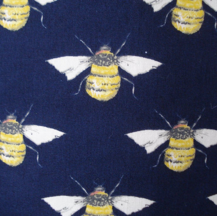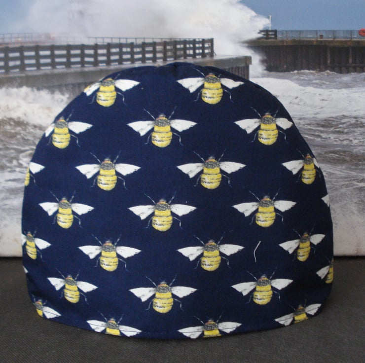 This is a handmade tea cosy for a 2-3 cup teapot. The Poly Cotton material is a navy blue with bumblebees. You can pull down the lining if it needs cleaning. Would make a great gift.