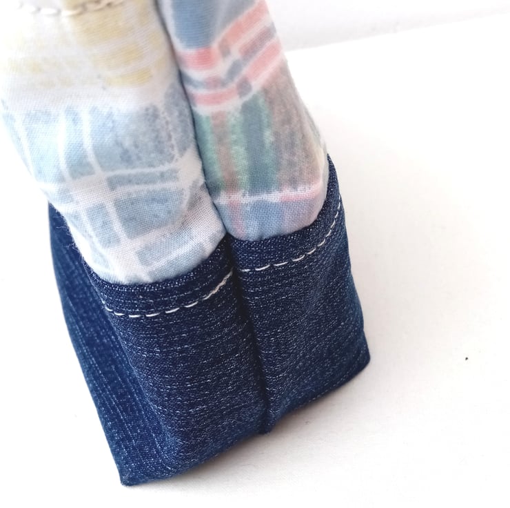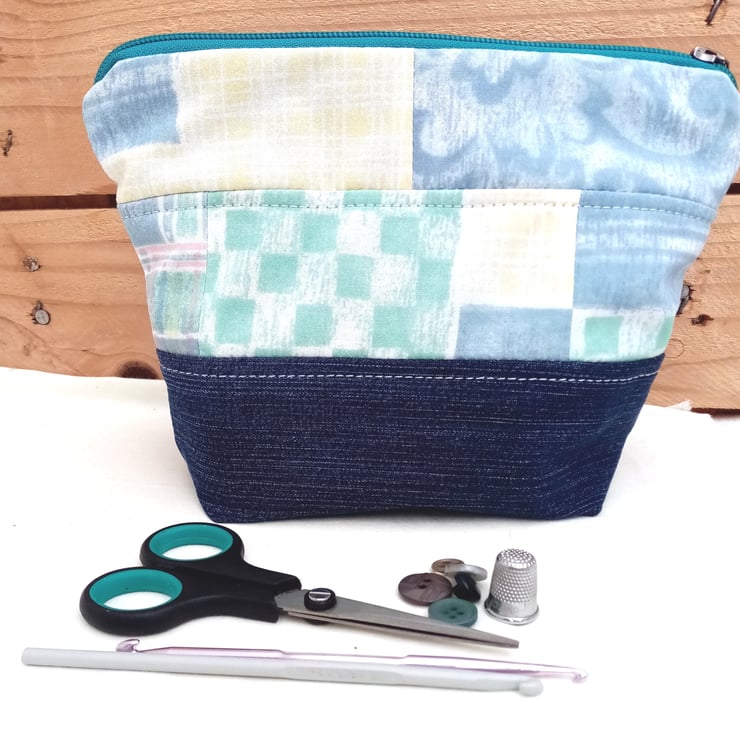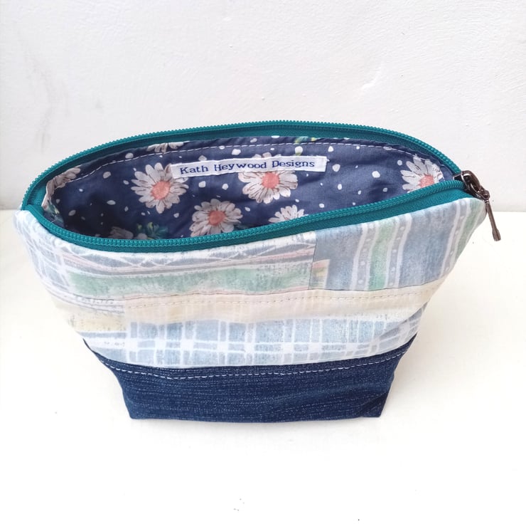 Fabric pouch with a zip fastening made from cotton and denim fabrics.