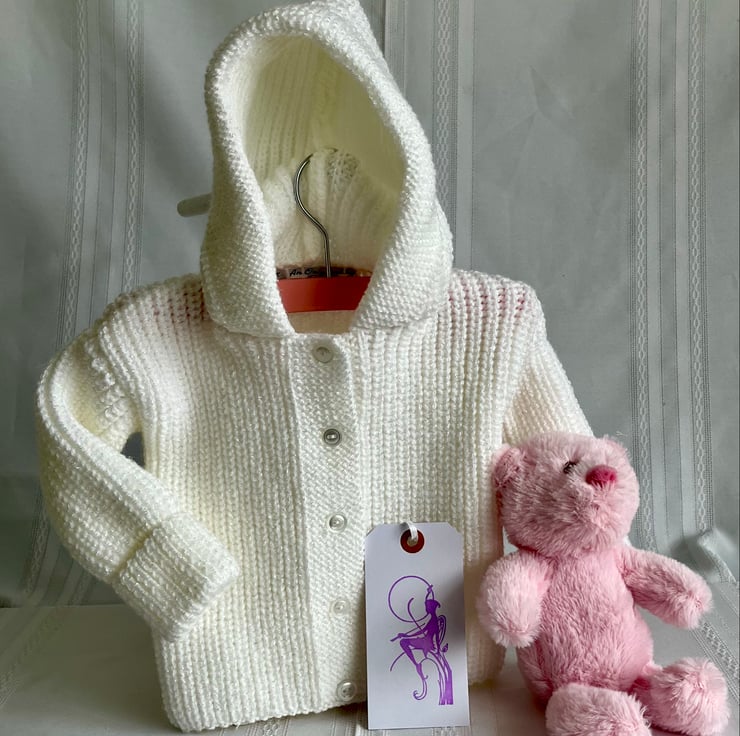 A handmade hooded jacket ideal for a little girl aged between 3 and 6 months old. I began making and selling these lovely items with the birth of my first grand-daughter nearly seven years ago. although I have been knitting for my family for many years.