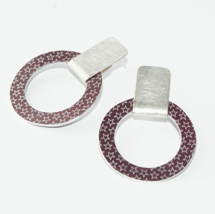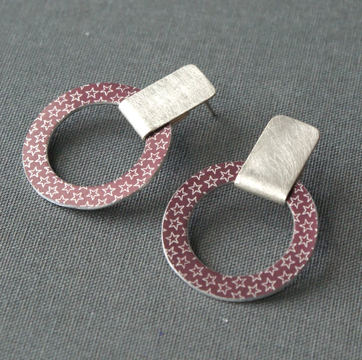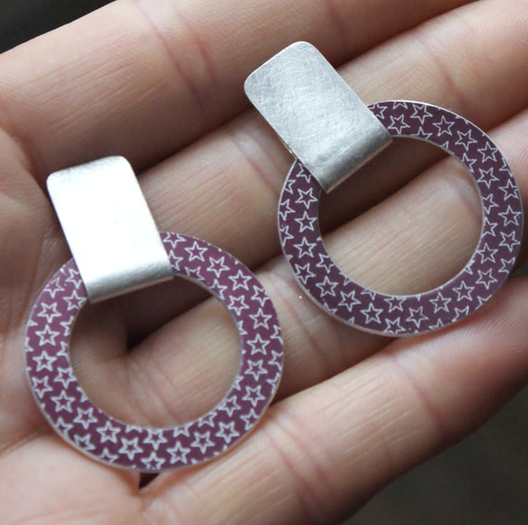 A fab pair of earrings to brighten up your day. The coloured parts are hand cut from anodised aluminium which features my star pattern and has been hand dyed. They hang from a sterling silver part with a stud fixing with a satin finish.