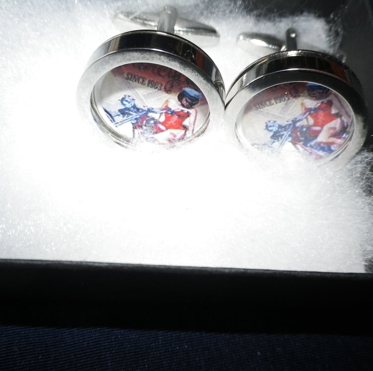 Biker Pin Up cufflinks, free shipping, gift wrapped, dramatic image Ref 8550