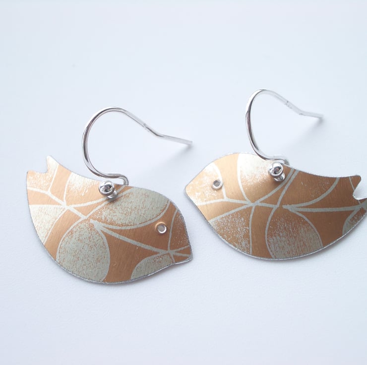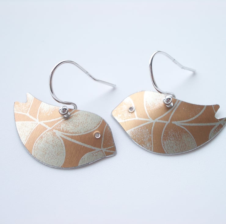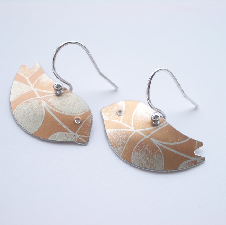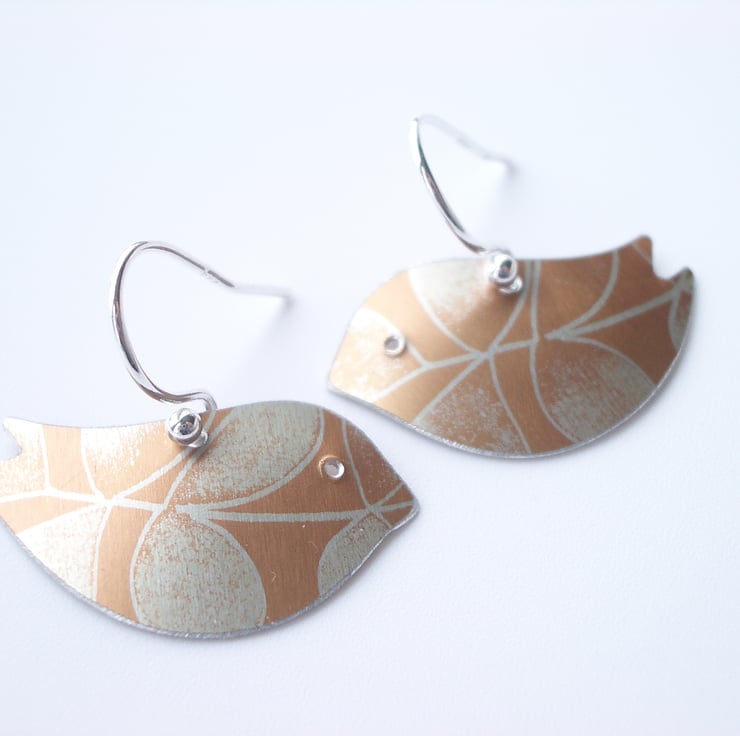 These bird earrings are made from aluminium which I have dyed and printed in a dusky orange with leaf prints. The bird shape is all hand cut using a piercing saw and I finish the edges with a file. Finally, I dome the bird slightly to give it depth and to make it catch the light.