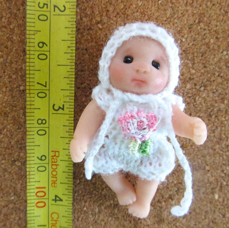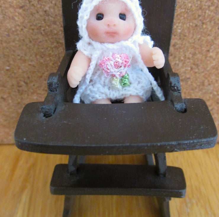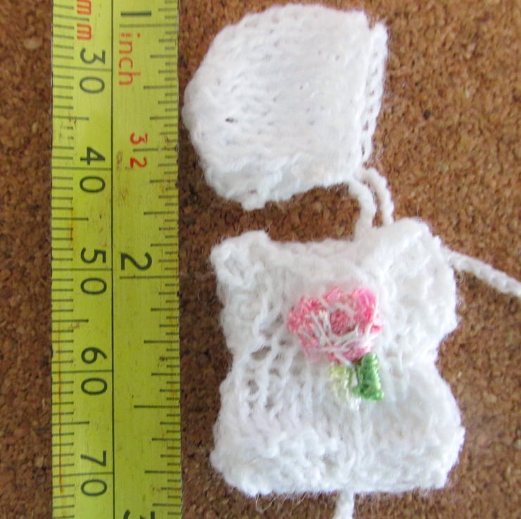 Hand Knitted tiny baby clothes for a doll house 1:12 baby, comprising romper suit with embroidered rose trim and bonnet with tiny ties. The romper opens at the back with a working tiny button to make it easy to put on and off the doll.