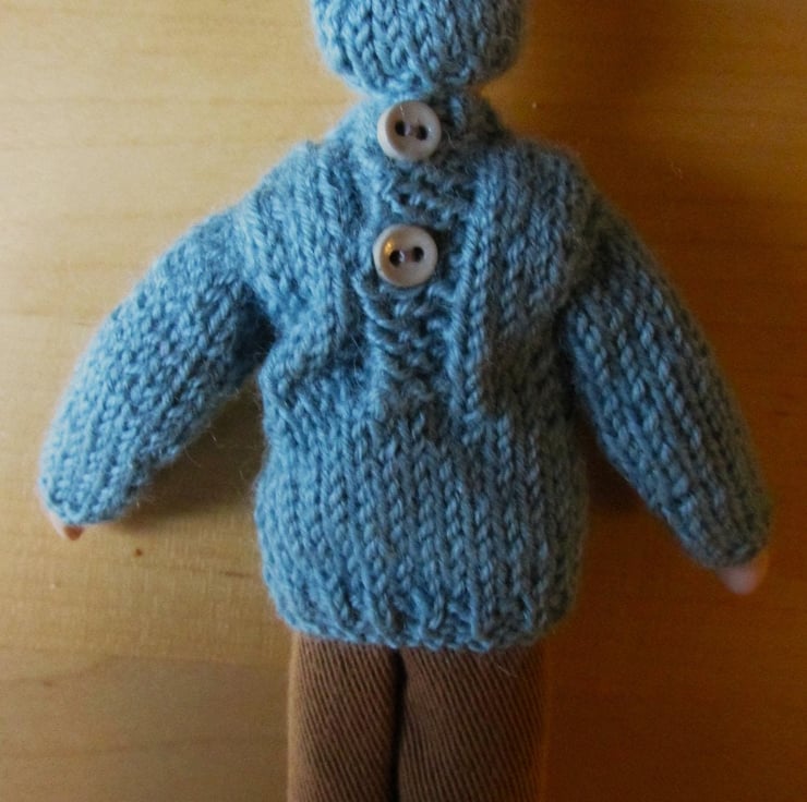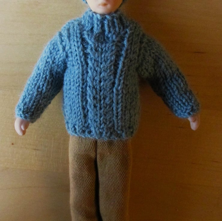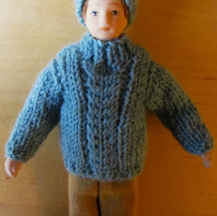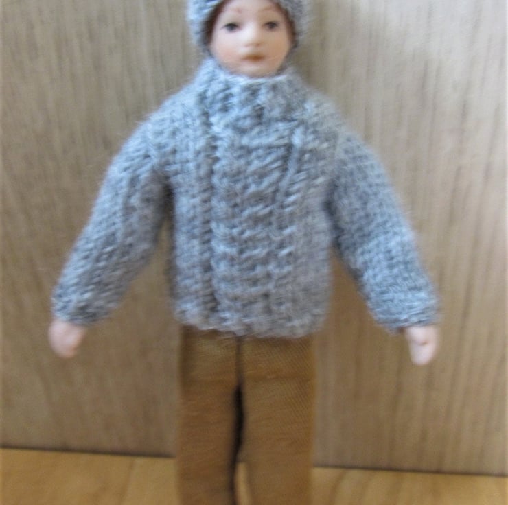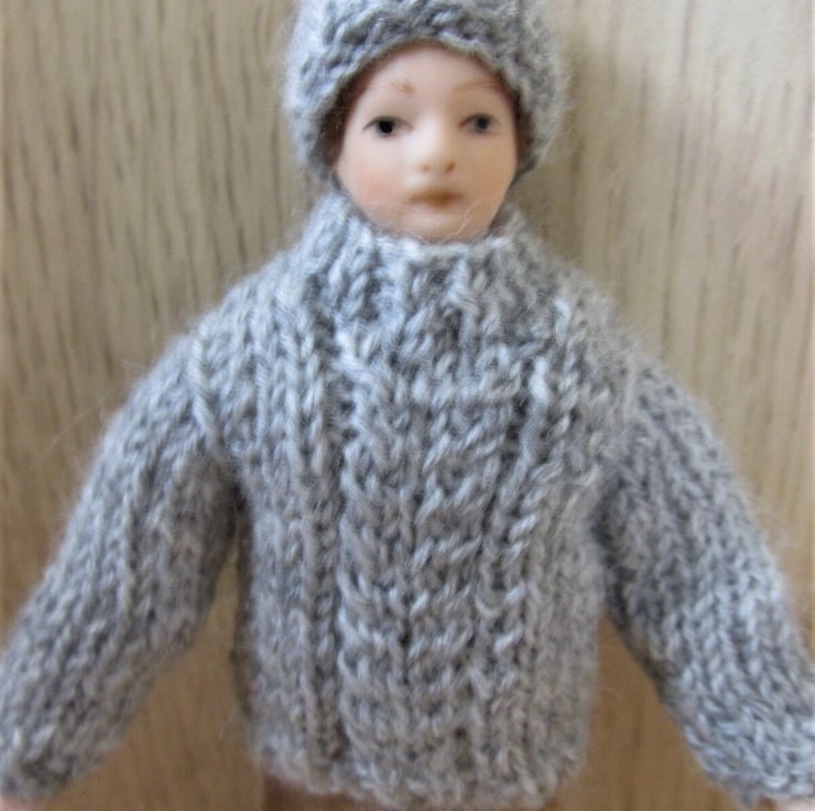 Hand Knitted sweater and hat for a doll house 1:12 scale figure. 75% extra fine wool in a grey marl colour with cable design, knitted under a magnifying light on 2mm needles. Opens at the back with 2 working buttons to make it easy to put on and off the doll.