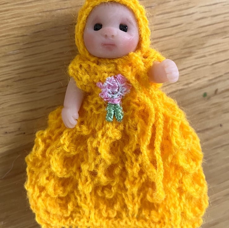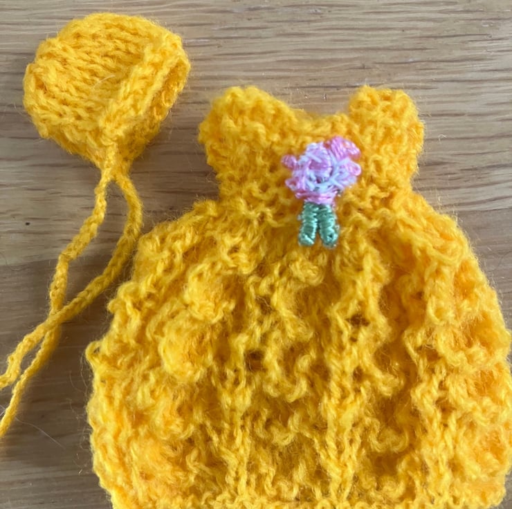 Hand Knitted tiny clothes for a doll house 1:12 baby, comprising christening robe with lace skirt and rose trim, fastening with a tiny working button at the back. Matching bonnet with tiny ties and rose trim. Made with fine yellow coloured thread yarn on 2mm needles to capture the detail of the knitting.