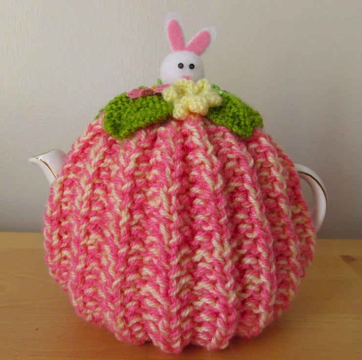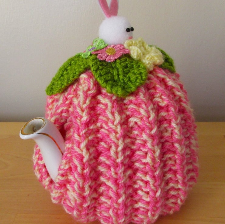 Hand Knitted tea cosy for a 2 teacup1 mug teapot. The cosy is made to fit a mini teapot, not full size. Lovely for your breakfast table and tea for two. Hand knitted in pink and lemon acrylic double knit yarn with rabbit, leaves and flower decoration and has holes for the spout and handle. The rabbit cannot be washed.
