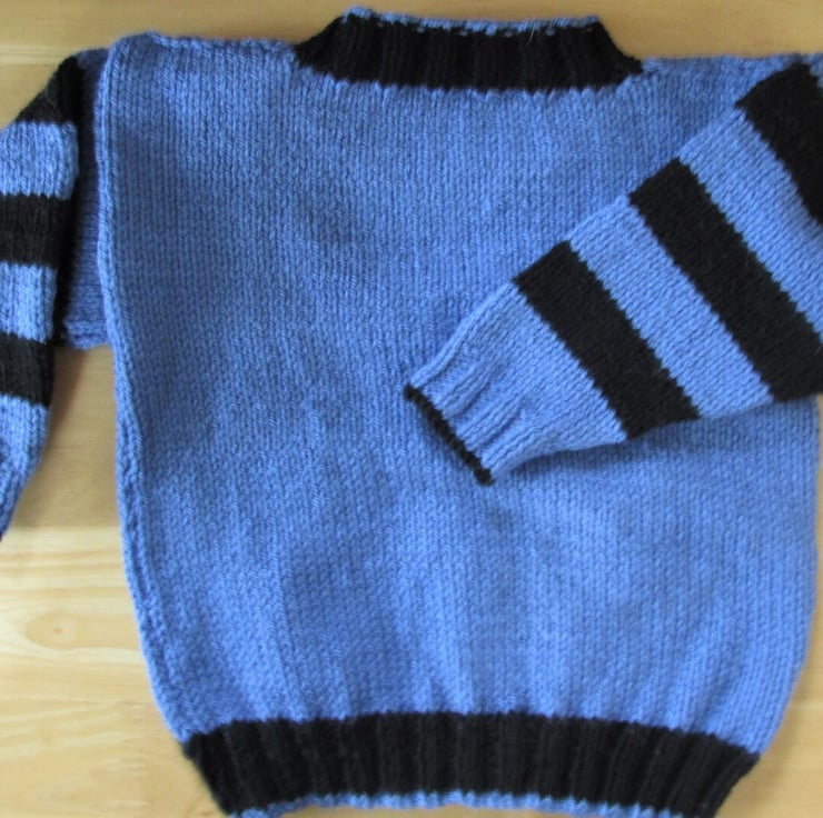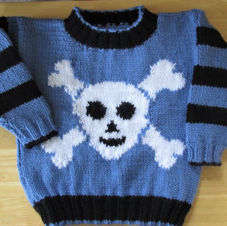 Hand knitted sweater with skull and crossbones motif on the front and striped sleeves. 22" chest measurement, length 12", sleeve length 8.5". Can be hand washed at 30 degrees or gentle machine cycle.