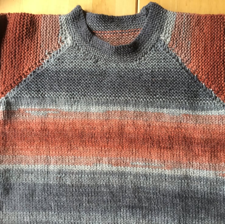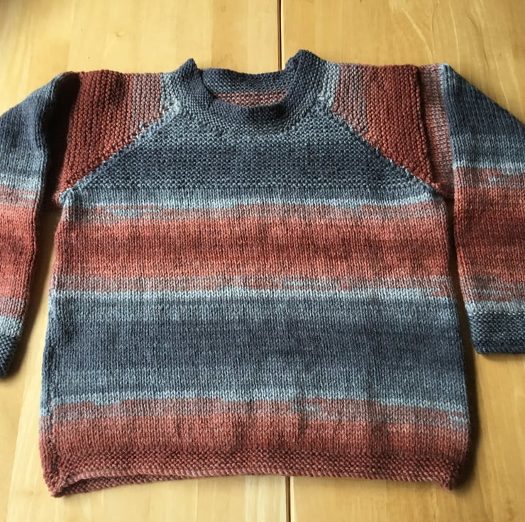 Hand knitted child's sweaterjumper. 28" chest measurement, shoulder to hem 15" and underarm to cuff sleeve seam 13". All measurements approximate. Can be hand washed at 30 degrees or gentle machine cycle. Mixed fibre yarn.