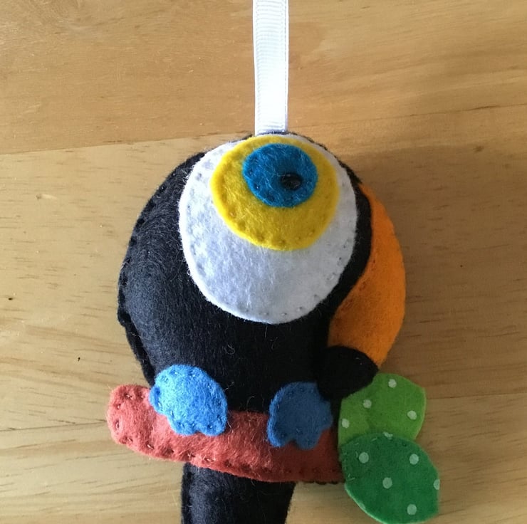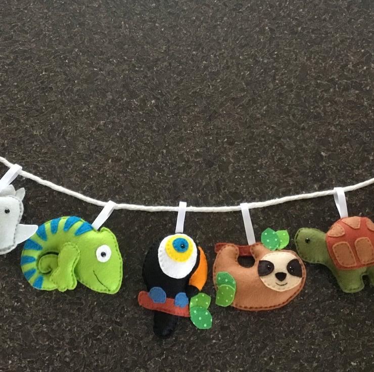 Hand stitched animal felt garland featuring various colourful animals on a rope string. Would look lovely in a nursery, a conservatory or a treehouse if you're lucky enough to have one! Can also be hung individually as each item has its own hanging ribbon. This item is not intended to be a toy and should be kept out of the reach of babies and young children.