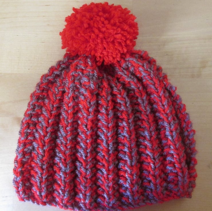 Hand Knitted tea cosy for a 2 teacup1 mug teapot. The cosy is made to fit a mini teapot, not full size. Lovely for your breakfast table and tea for two. Hand knitted in red and light purple acrylic double knit yarn with pom pom decoration and has holes for the spout and handle. Can be washed by hand or at 30 degrees in the machine.