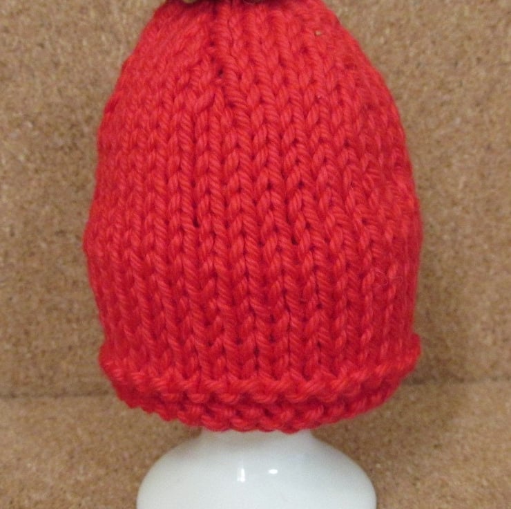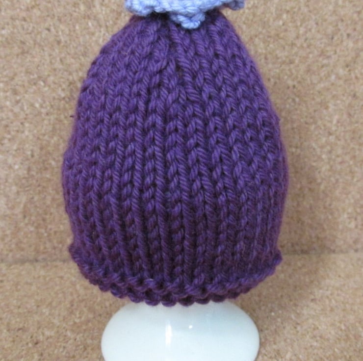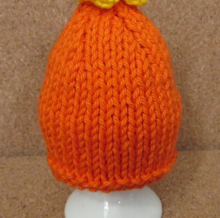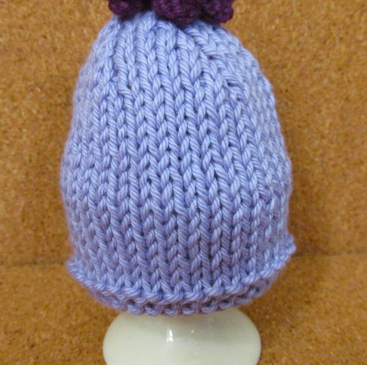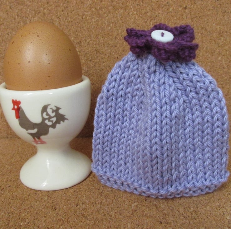 Hand knitted egg cosies with flower decoration for your breakfast table. The cosies are sold singly and are approximately 3 inches high and 5 inches all around the opening. Hand wash.
