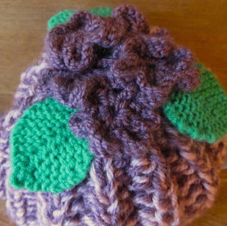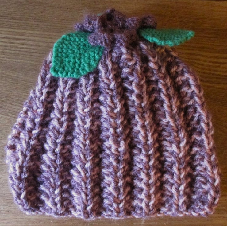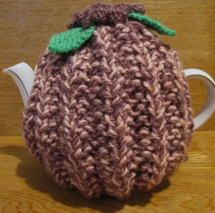 Hand Knitted tea cosy for a 2 teacup1 mug teapot. The cosy is made to fit a mini teapot, not full size. Lovely for your breakfast table and tea for two over the festive season. Hand knitted in pale pink and plum acrylic double knit yarn with flower posy decoration and has holes for the spout and handle. Can be washed by hand or at 30 degrees in the machine.