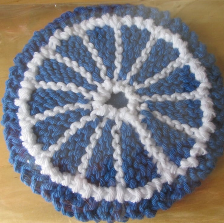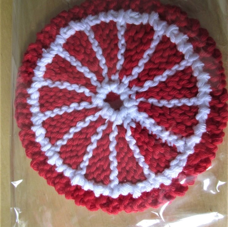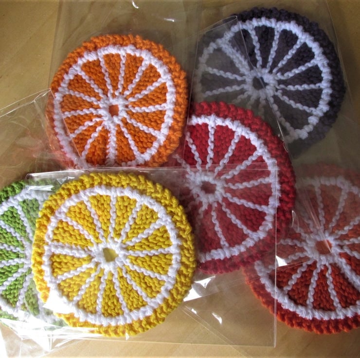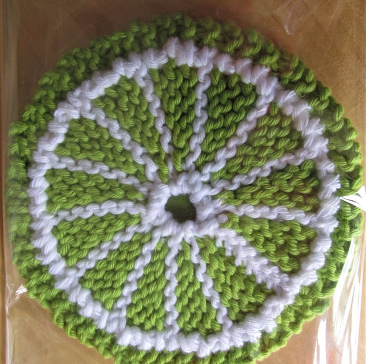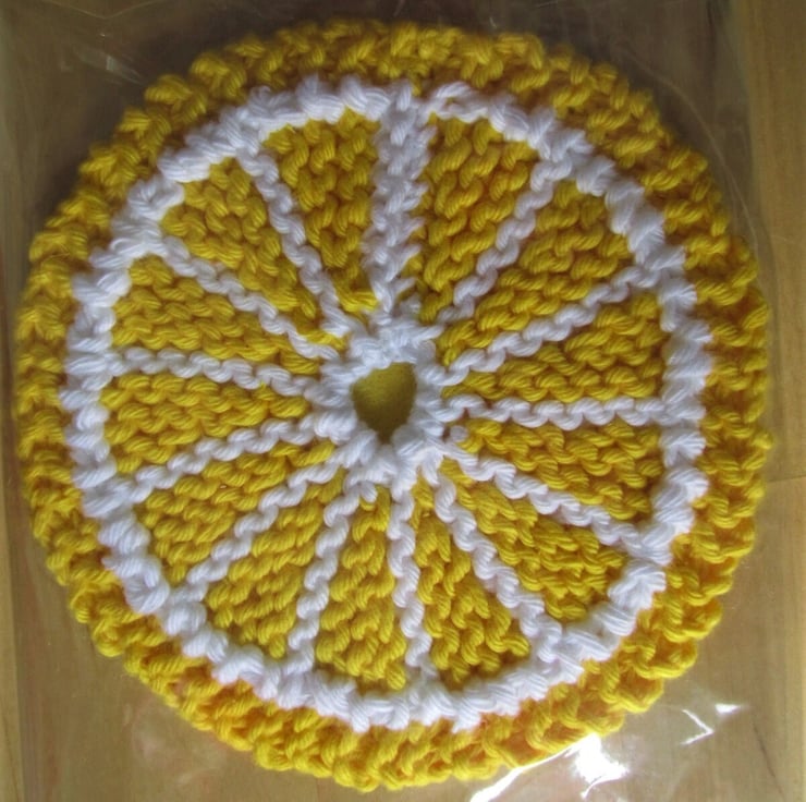 Hand knitted fruit slice coaster with felt back. Great for picnics and outdoor get togethers. 100% cotton yarn with felt backing can be sponged clean.