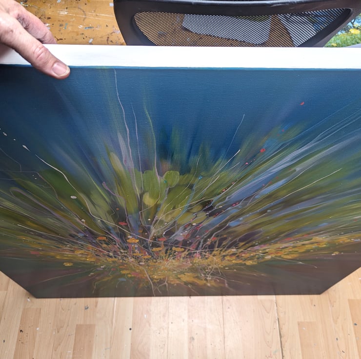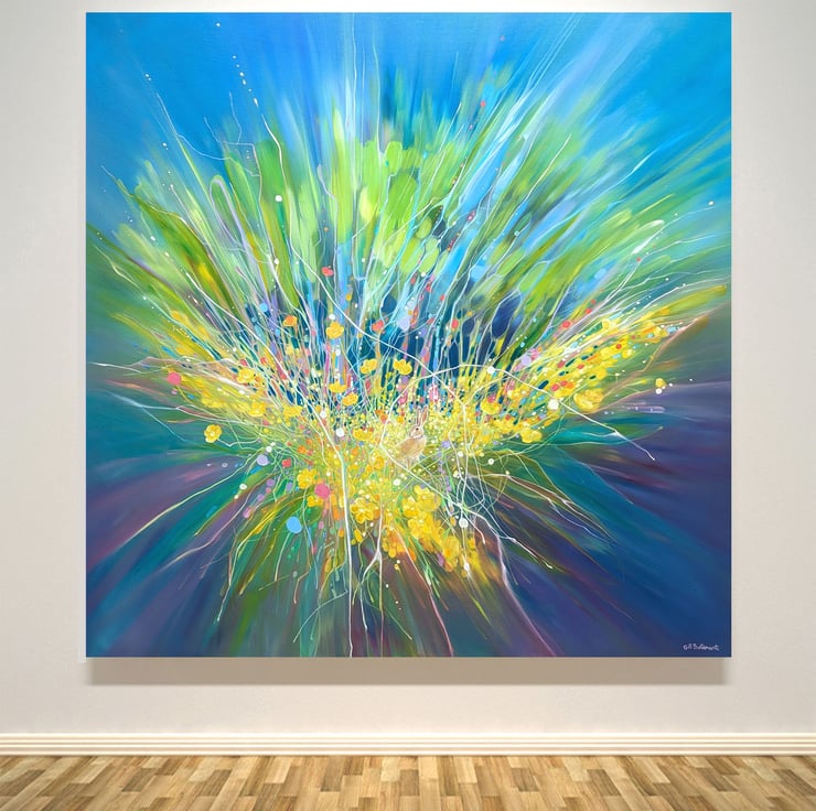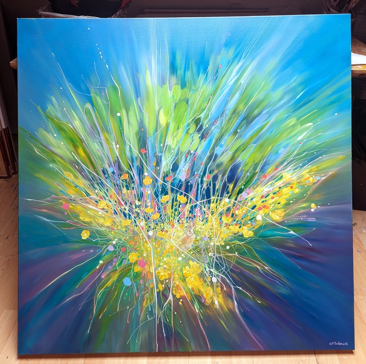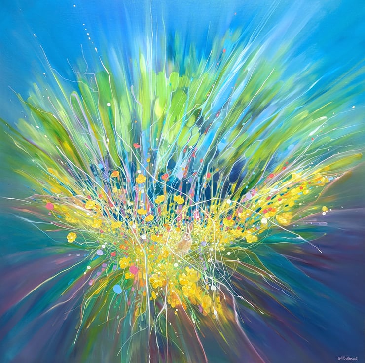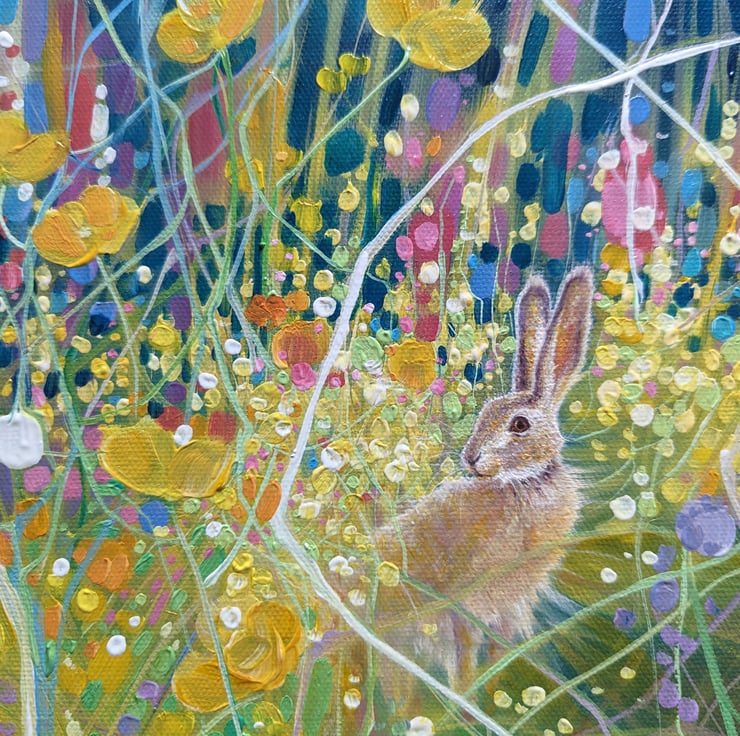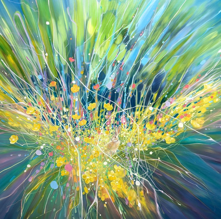 Summer Riot is a large square semi-abstract landscape painting of a hare in a wild summer meadow. It is 40x40x1.5 inches. The idea of this painting was to show the sheer enthusiasm with which nature expresses itself – even in the smallest corner of a summer field. It is literally exploding with life and energy. The flowers are fairly abstract but hint at buttercups and clover and a mad array of grasses and other wildflowers. The hare is hiding to the right of the centre of the summer explosion and she looks a little confused by it all. The edges are blurred and the paint thickness varies a lot in order to add to the slightly mad energy of it. It was painted after a walk I took recently near the South Downs where the farmland is simply beautiful and a corner of a meadow is endlessly entertaining (to me at least). I did see a hare in the distance but she did pose for more as this one does (I do love artistic license). Painted on deep edge canvas, white edges, ready to hang, no frame needed and comes with certificate of authenticity and gifts from the artist.