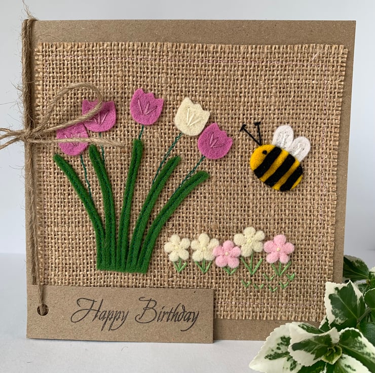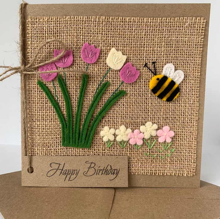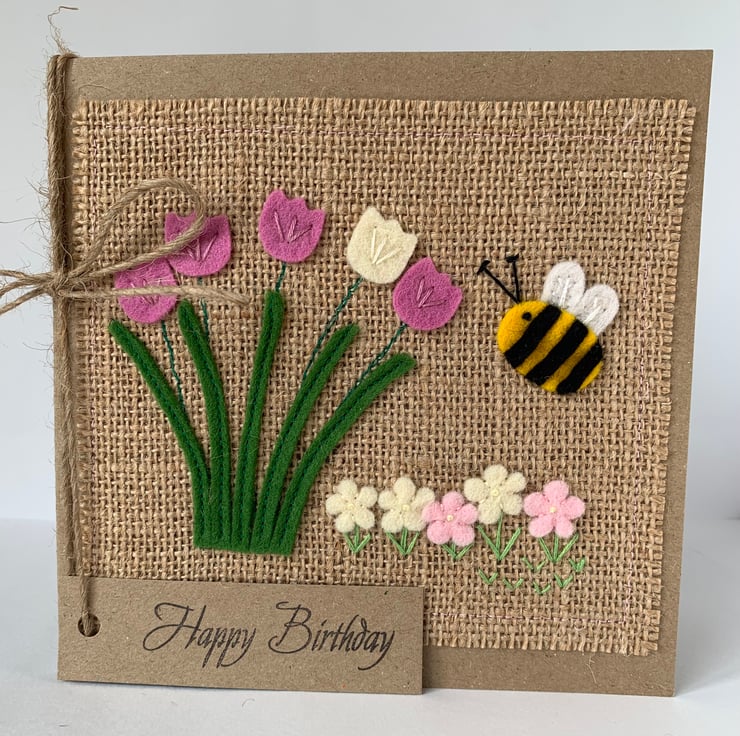 A handmade Birthday card decorated with stems of rose pink and cream flowers and small flowers in pale pink and cream with a bee.