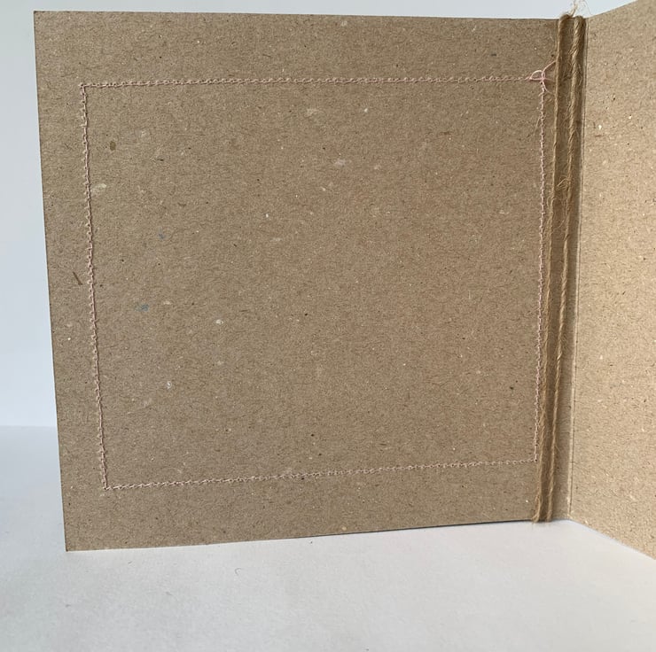 The hessian is machine stitched using a contrasting thread, onto a plain brown recycled card. This stitching is visible on the inside of the card.