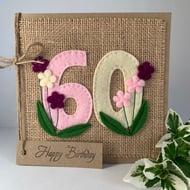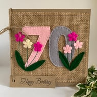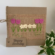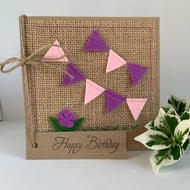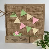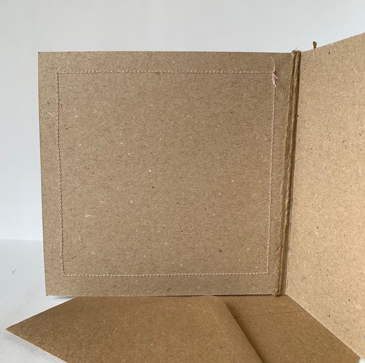 The hessian is machine stitched using a contrasting thread, onto a plain brown recycled card. This stitching is visible on the inside of the card.