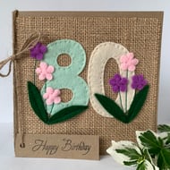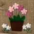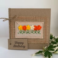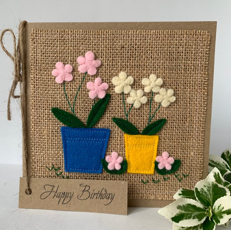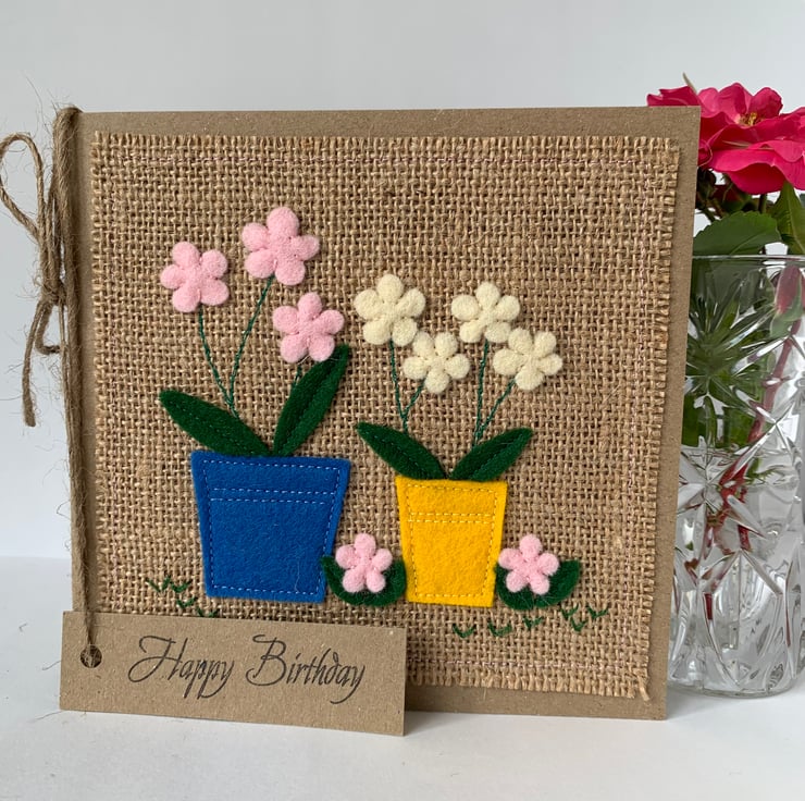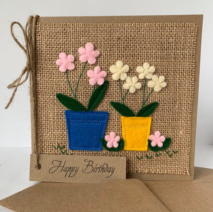 A handmade birthday card decorated with pale pink and cream flowers in bright yellow and blue planters.
