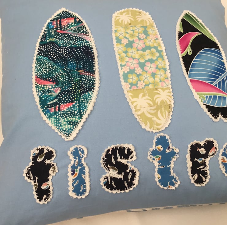 Appliquéd surfboards and Fistral lettering in Liberty fabrics on a blue cotton fabric. The cover has a reverse fabric by Clarke&Clarke with coral in blue. Lined with an organic white cotton and closed with an invisible zip along the bottom, the cover is suitable for a 40cmx40cm feather pad insert (this is for the cover only). Suitable for home or Kombi, a reminder of the iconic Fistral beach in beautiful North Cornwall..