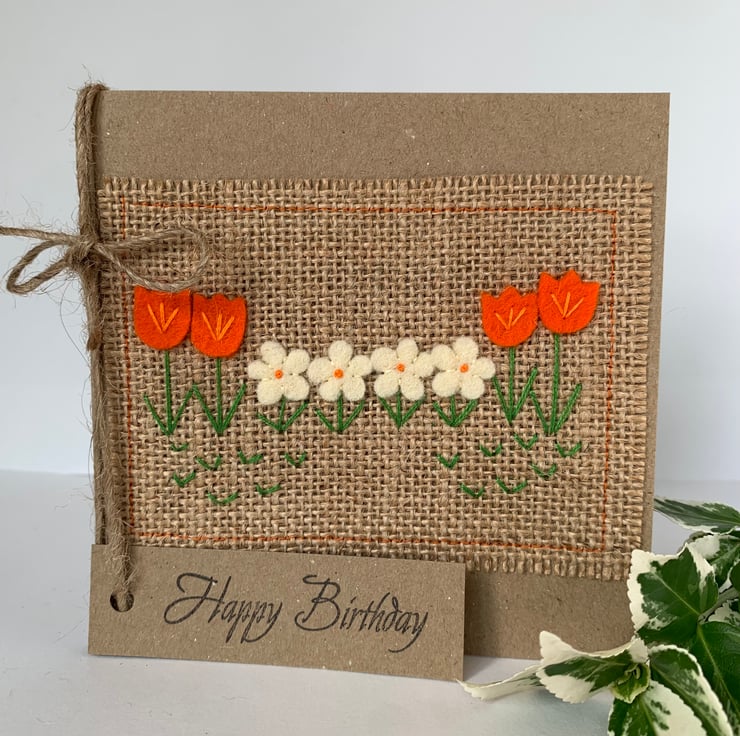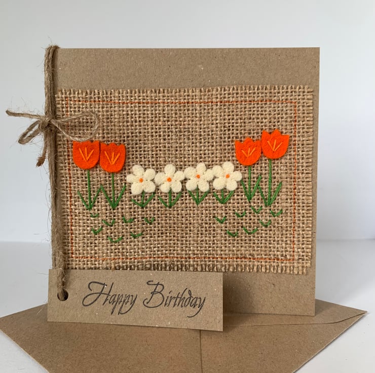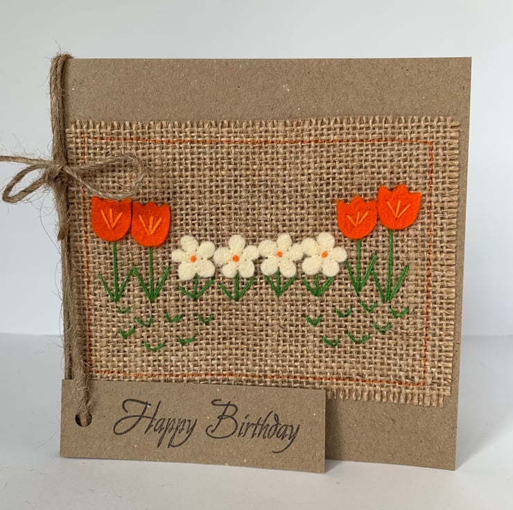 This unique handmade card is decorated with delicate flowers in bright orange and cream. The decoration is hand cut from 100% wool felt. It is then sewn by hand onto a hessian background.