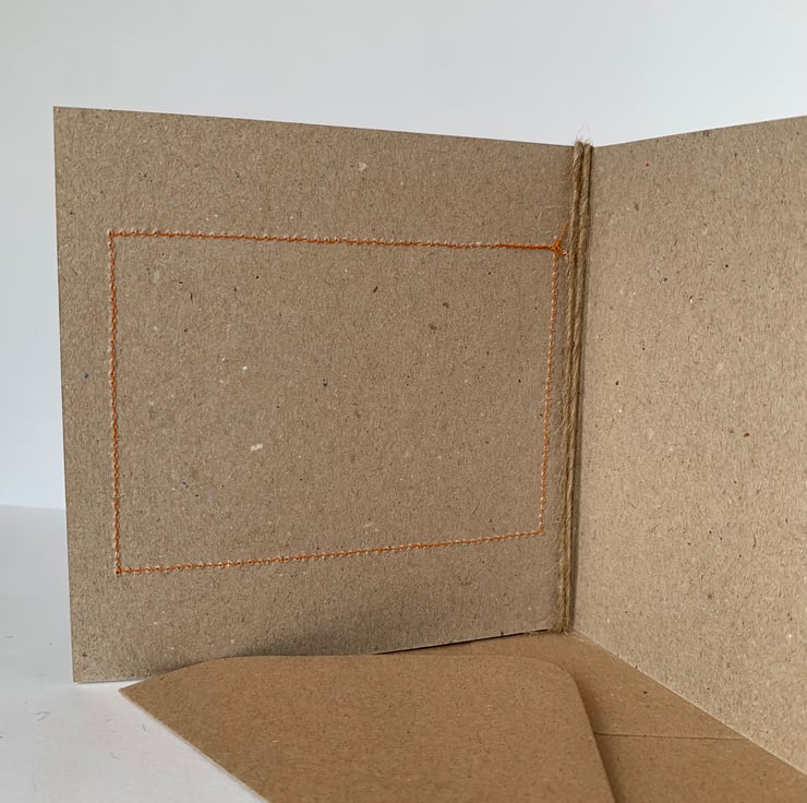 The hessian is machine stitched, using a contrasting thread, onto a plain brown recycled card. This stitching is visible on the inside of the card.