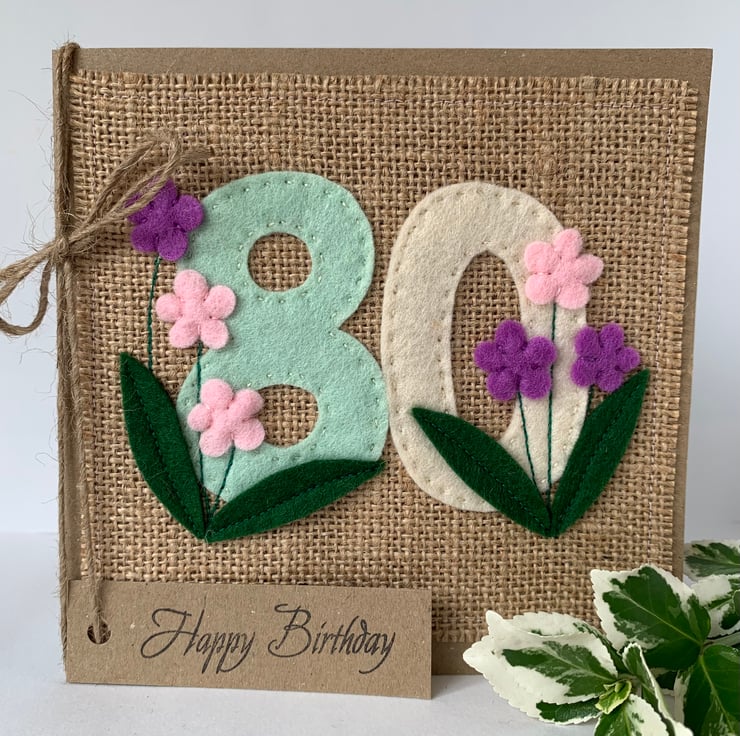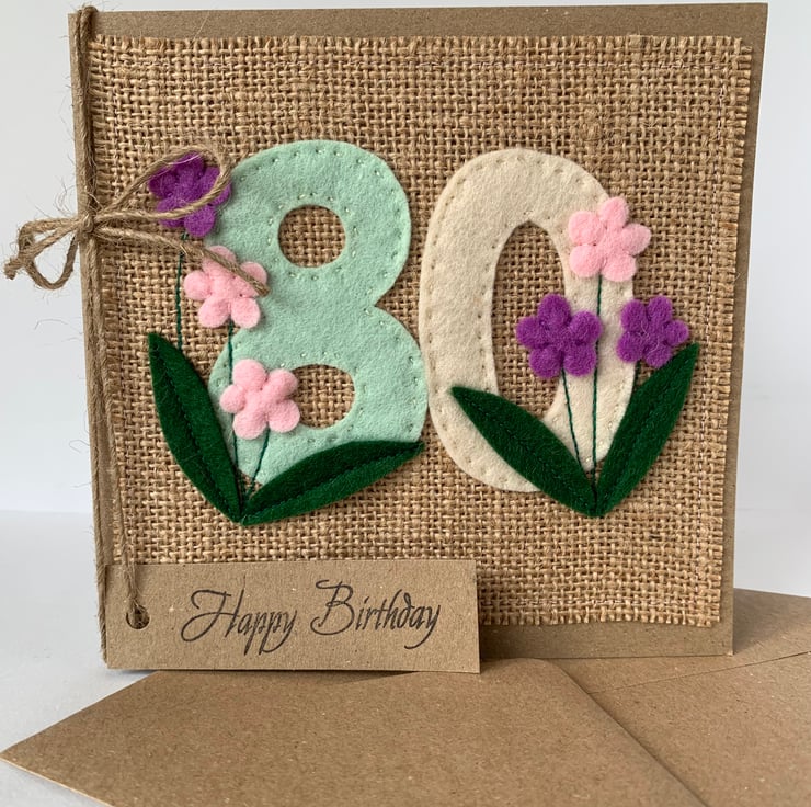 A unique handmade card for a special birthday. The numbers for this 80th birthday are hand cut from cream and mint green wool felt and hand sewn to a hessian background. Flowers, hand cut from wool felt, in pale pink and purple are added to decorate the card.