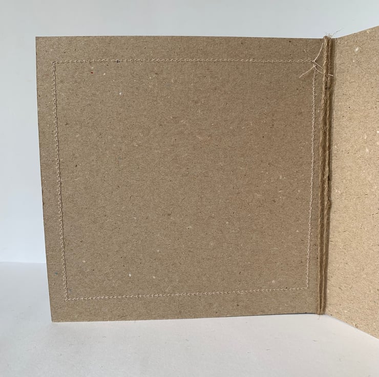 The hessian is machine stitched, using a contrasting thread, onto a plain brown recycled card. This stitching is visible on the inside of the card.