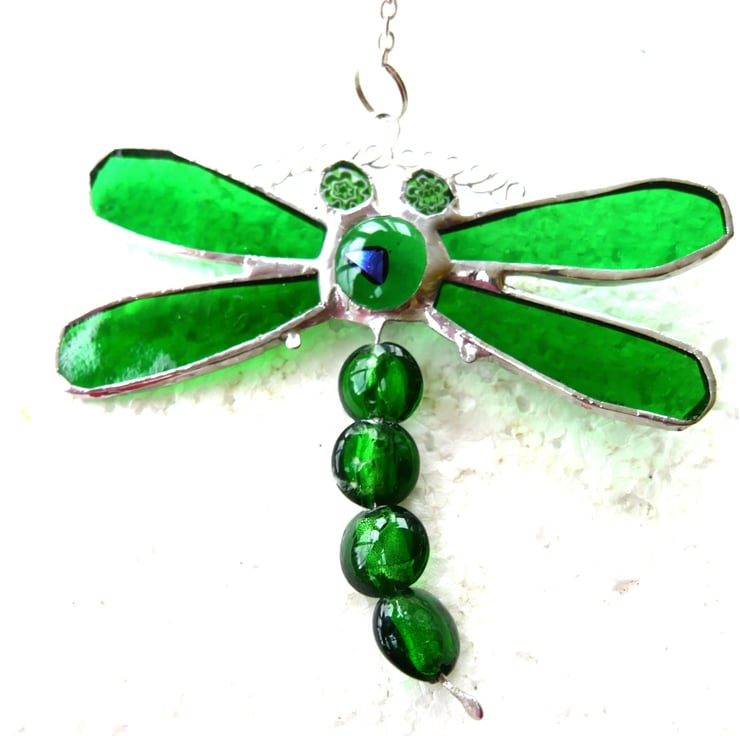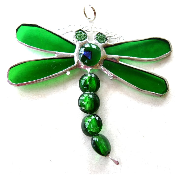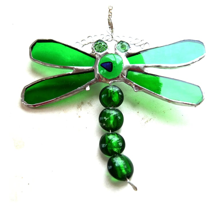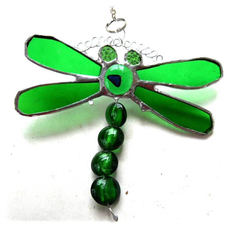 Dragonfly Suncatcher Stained Glass Green Bead-Tailed 055
