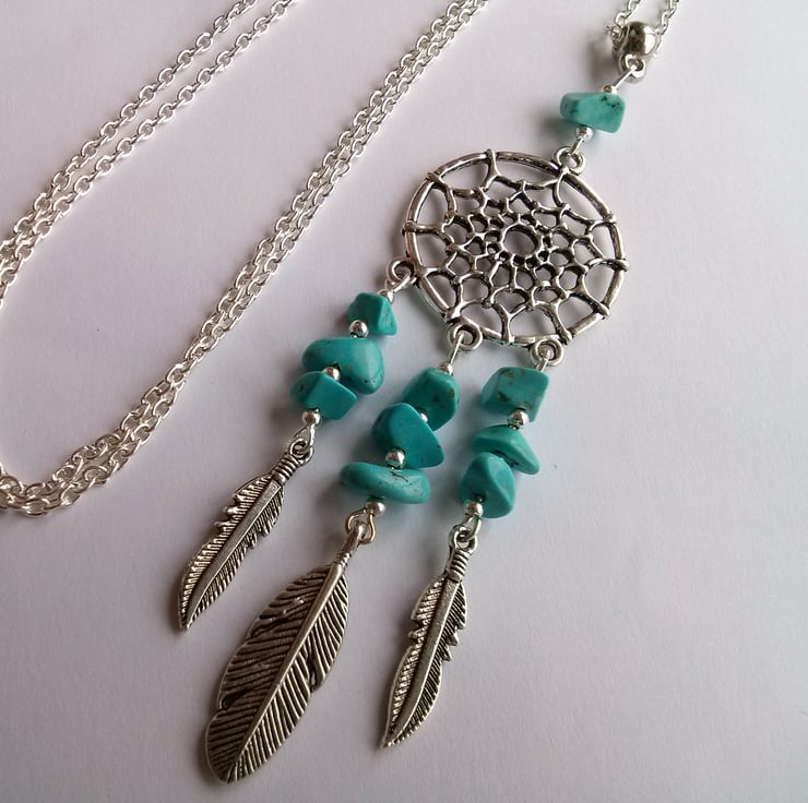 This nice necklace has a beaded turquoise howlite dreamcatcher hanging on 26" silver plate chain.