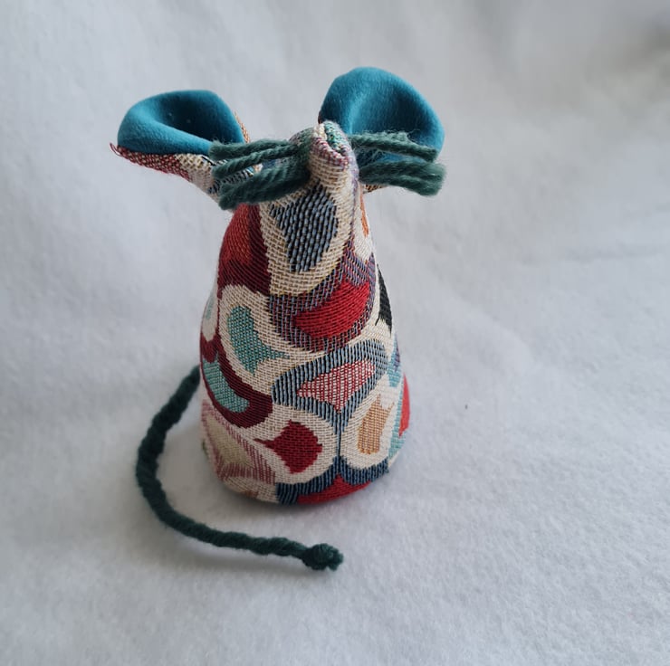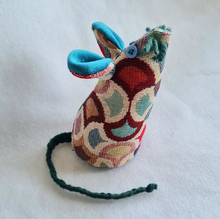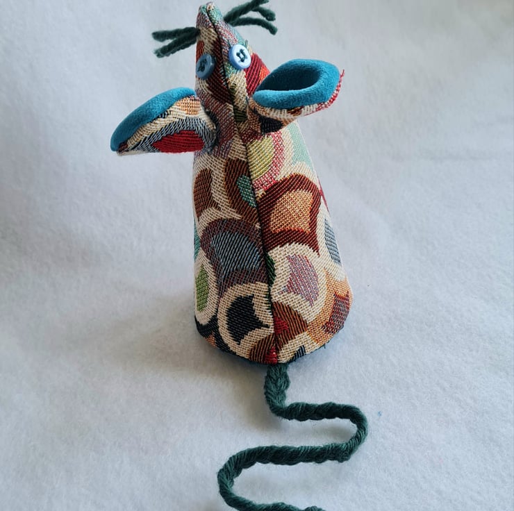 The tail is plaited from teal wool. His whiskers are teal wool. Her eyes are made from small vintage buttons.