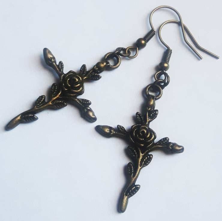 These nice earrings have bronze rose cross charms hanging on bronze hooks.