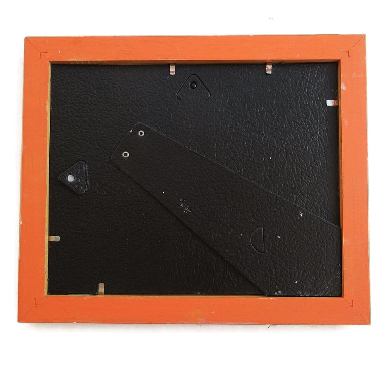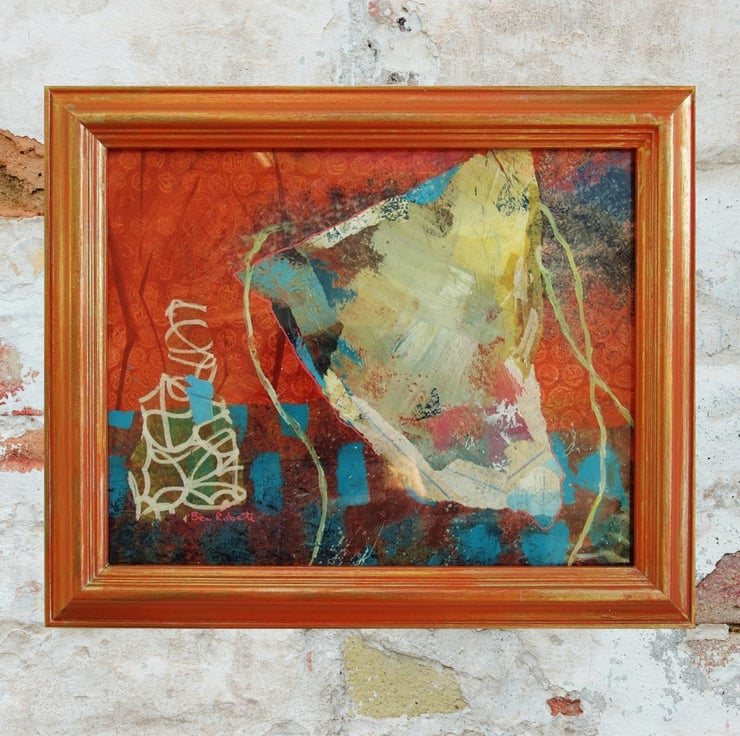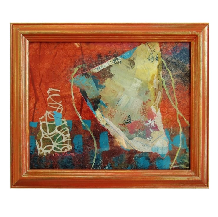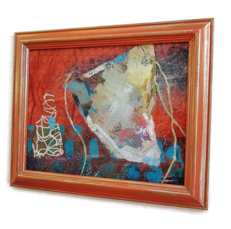 Abstract boat / harbour / nautical / coastal / marine themed artwork in acrylic and collage, ready mounted in a wooden frame which is painted to match the colour tones of the artwork. The frame is 12 x 10 inches, in a warm orange with gold over painting and the aperture (actual picture size) is 9.5 x 7.5 inches. I have replaced the original glass with acetate which looks the same, but makes it lighter and easier to post. The painting is signed on the front and has a rich, warm colour palette. Coming to you with a certificate of authenticity.
