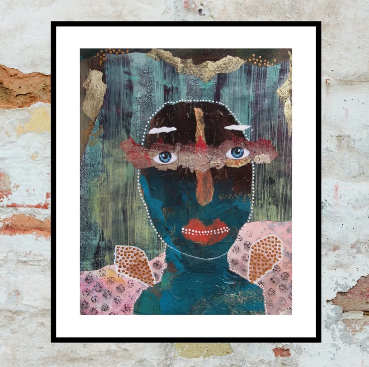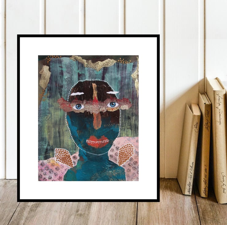 Richly toned abstract figurative painting in acrylic, collage and drawing pens on 8 x 10 inch 2mm deep board. Slightly surreal angel, which has a soft sheen surface finish and comes to you unframed. (Framed photos are for illustrative purposes only.) Ideal to pop straight into any standard sized 8 x 10 inch frame or mount.