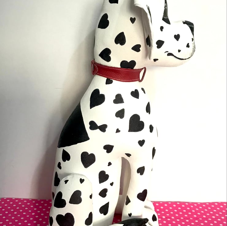Our unique Heart Dalmatian Keepsake is made from heavy duty cotton calico cut from my own hand draw pattern. They are then filled with soft hypoallergenic fibre stuffing and a lined kiln dried sand bag.