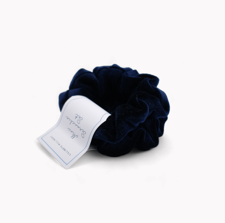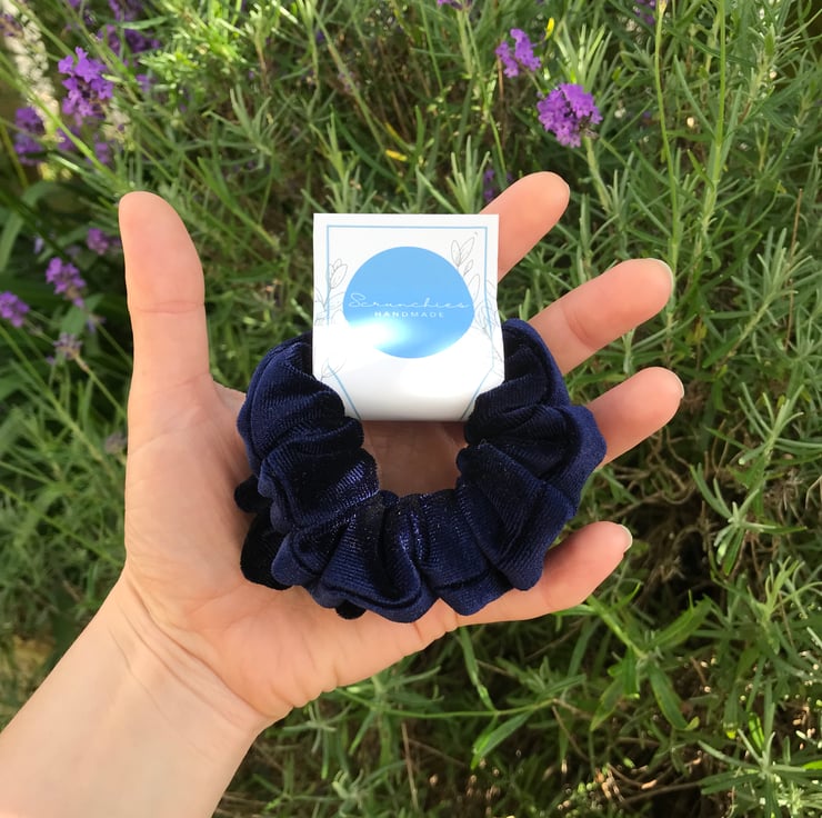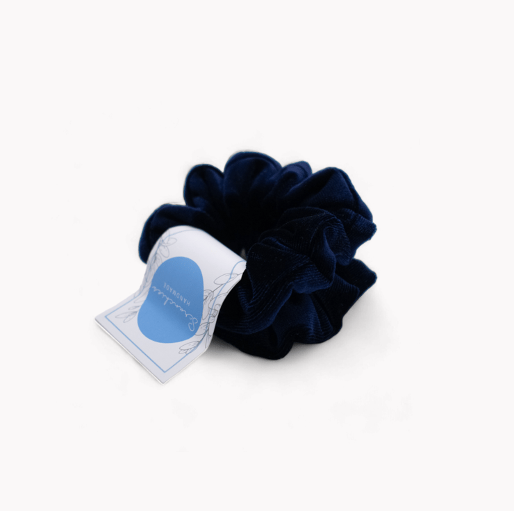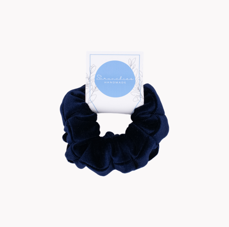 Set of 2 mini scrunchies handmade in a sumptuous navy blue velvet fabric.
