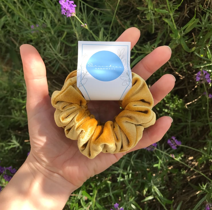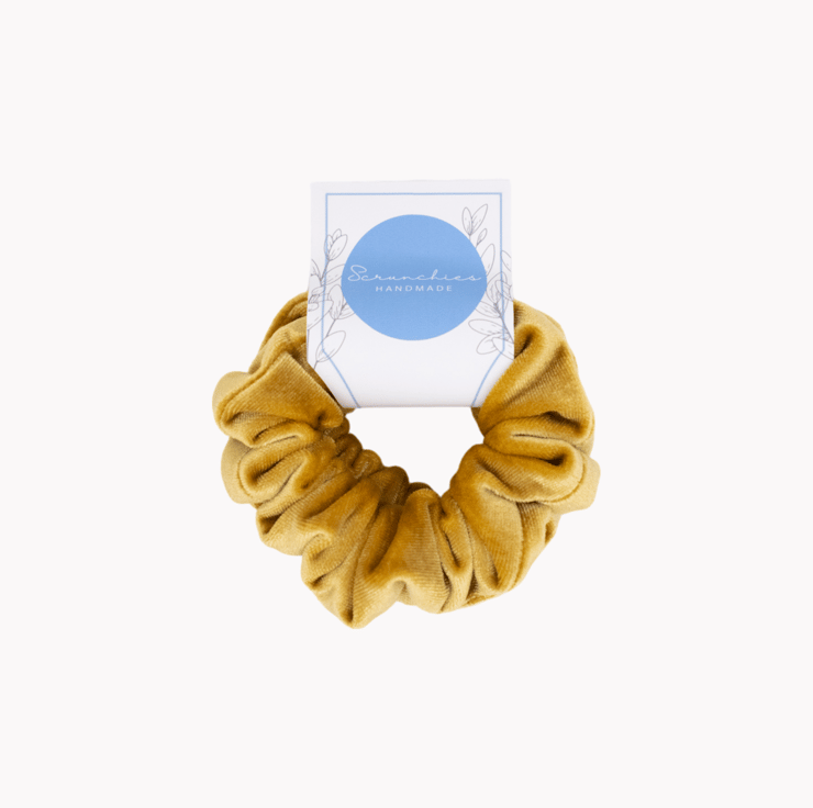 Set of 2 mini scrunchies handmade in a sumptuous mustard yellow velvet fabric.