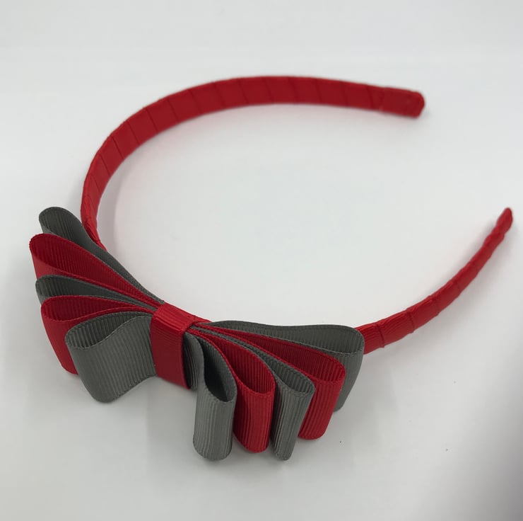 Our hairbands are handmade here in our little shop. They are so cute the could compliment any school Uniform with red and grey in it. They are ideal for keeping those sneaky little curls from straying into your little one's eyes.
