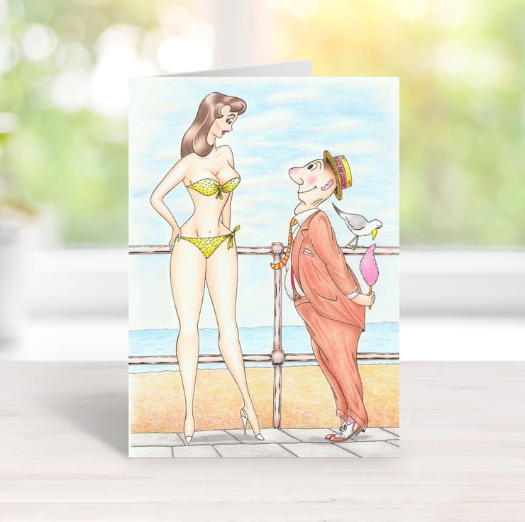 An original art greeting card featuring a hand-drawn pencil illustration of an odd couple pitching woo, by the sea.