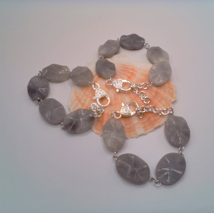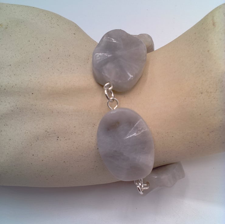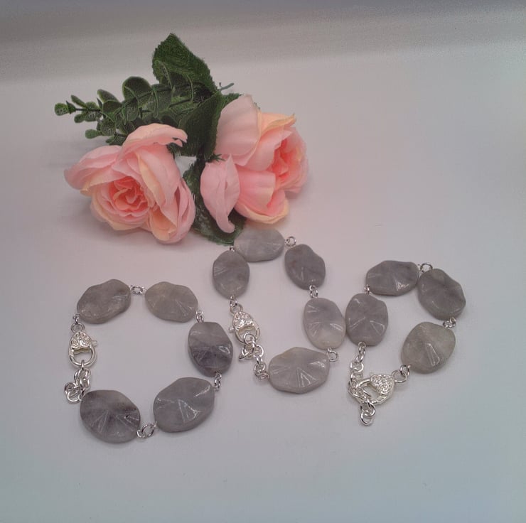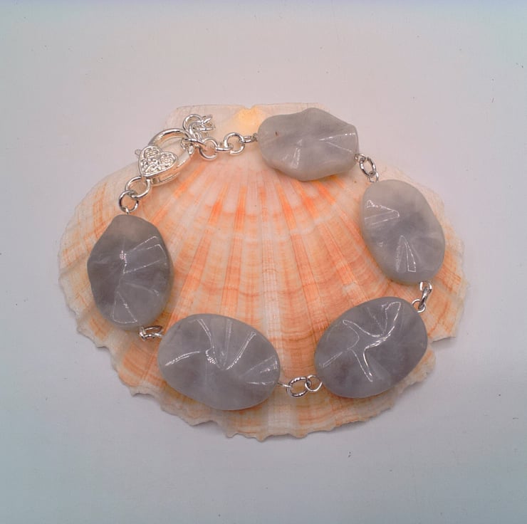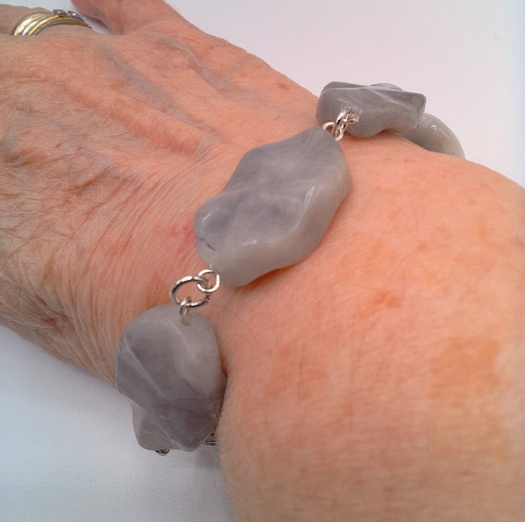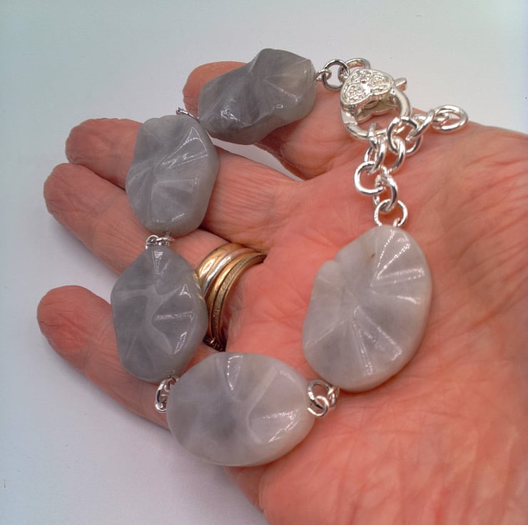 These very pretty bracelets would go well with any of your Spring or Summer outfits that you wear everyday for work or for a casual party or evening out. It would also make a lovely gift for any special lady for a birthday or anniversary, or as a lovely treat for yourself. The bracelets are made using 4 or 5 large chunky silver grey faceted oval beads each measuring 30 mm x 20 mm x 5 mm. Each bracelet also has an extender chain measuring approx 3 cm to increase the length if required, and they are fastened with a pretty silver plated heart lobster clasp. 2 of the bracelets measure 8.25 inches (21 cm) and one measures 6.75 inches (17.25 cm), please select the length required when you order or let me know the length you require in a message. The bracelets will be dispatched wrapped in tissue paper in an organza bag and delivered to you via Royal Mail first class post.