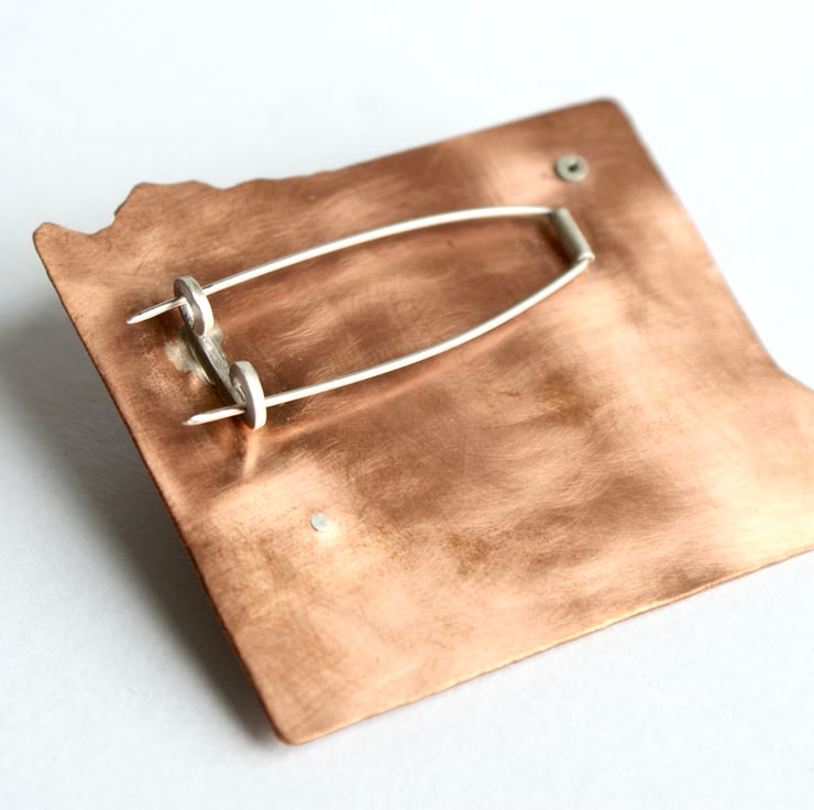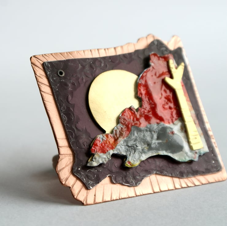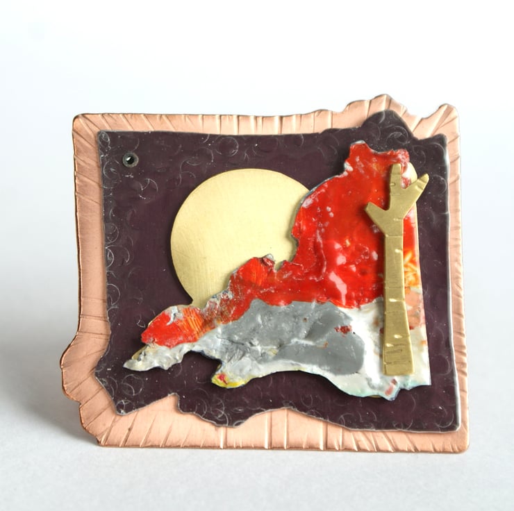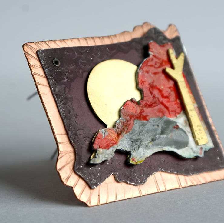 This one of a kind brooch is the outcome of my jewellery designs and painted landscapes. The brooch is constructed in layers made from copper, anodised aluminium, and brass. The coloured part is made from acrylic paint that is fixed to aluminium and varnished. . The copper and aluminium have been hammered and textured and the 5 pieces are connected with rivets. The double brooch pin is made from stainless steel for extra strength.