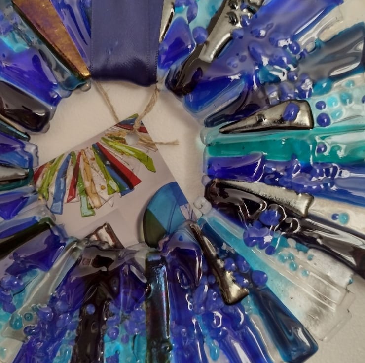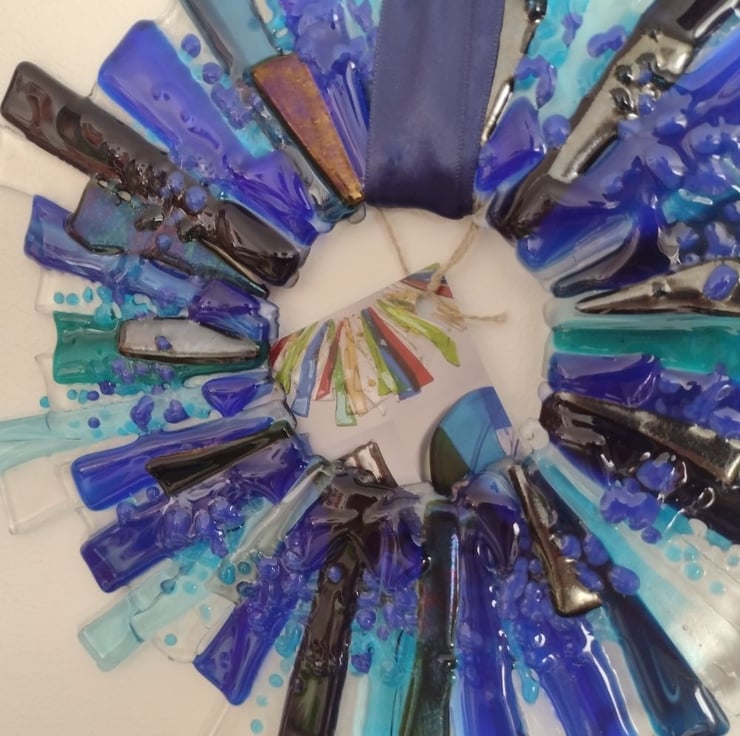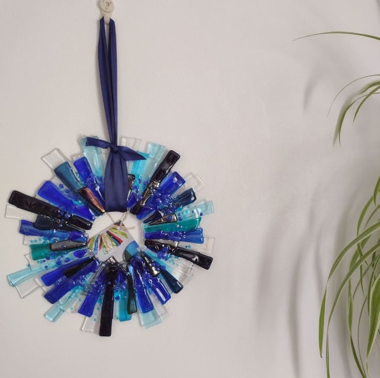 This beautiful fused glass wreath in a variety of blues looks gorgeous hung on a wall, in a window, or from a beam. It features pieces of irridescent glass that shine with a rainbow hue in certain lights.