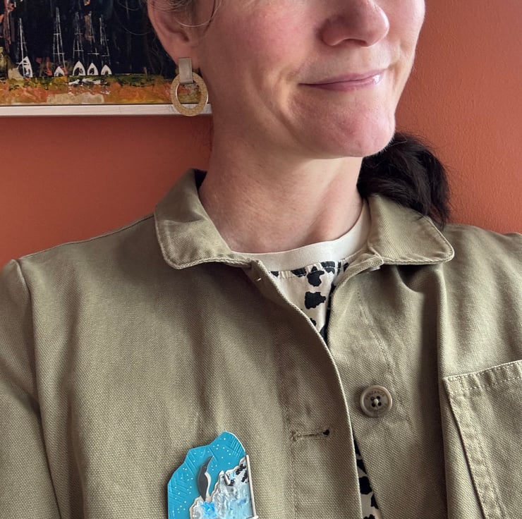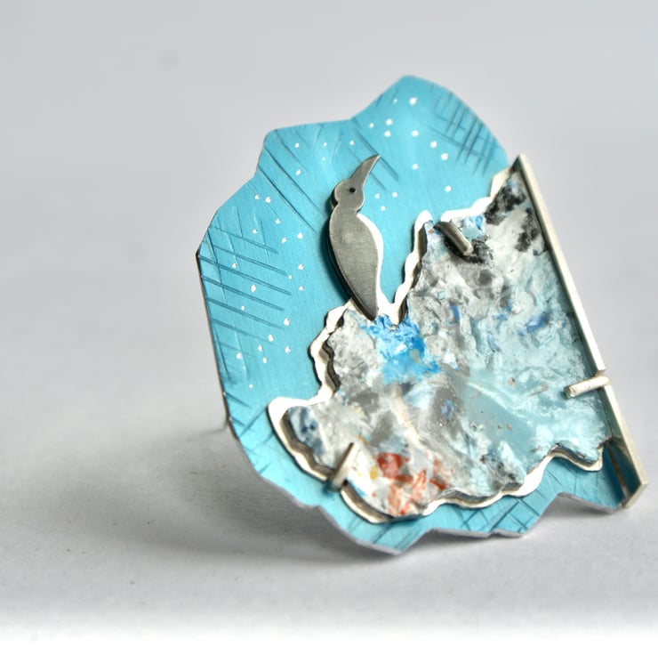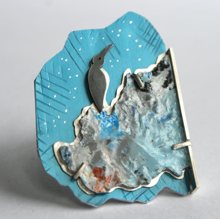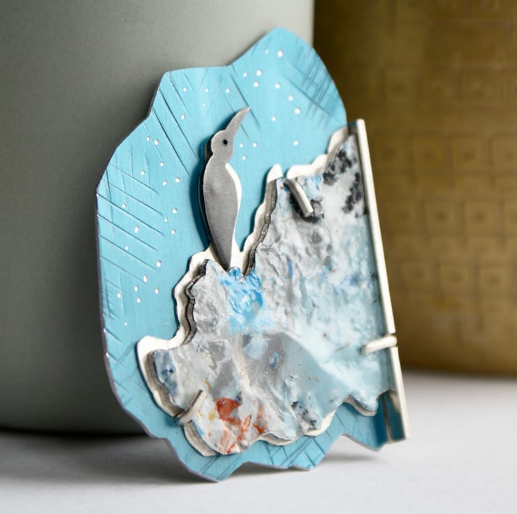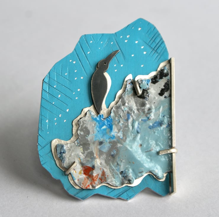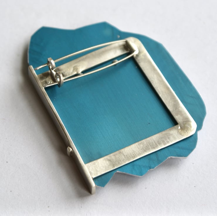 This one of a kind brooch is the outcome of my jewellery designs and painted landscapes. The brooch is constructed in layers made from sterling silver and anodised aluminium. The coloured front part is made from acrylic paint that is fixed to aluminium and varnished. . The aluminium has been hammered and textured and the 3 layers are connected to a sterling silver framework with a claw style setting. The double brooch pin is made from stainless steel for extra strength.