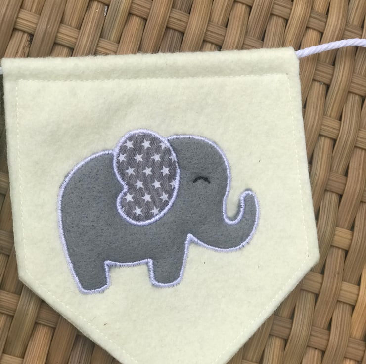 Each flag is made from wool felt in neutral colours with end flags of little elephants.