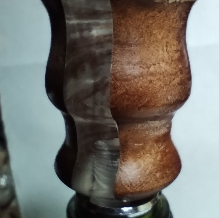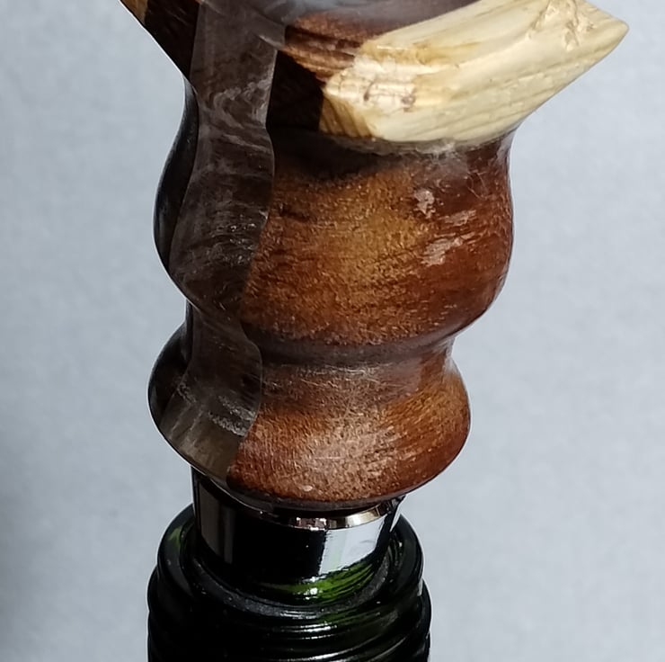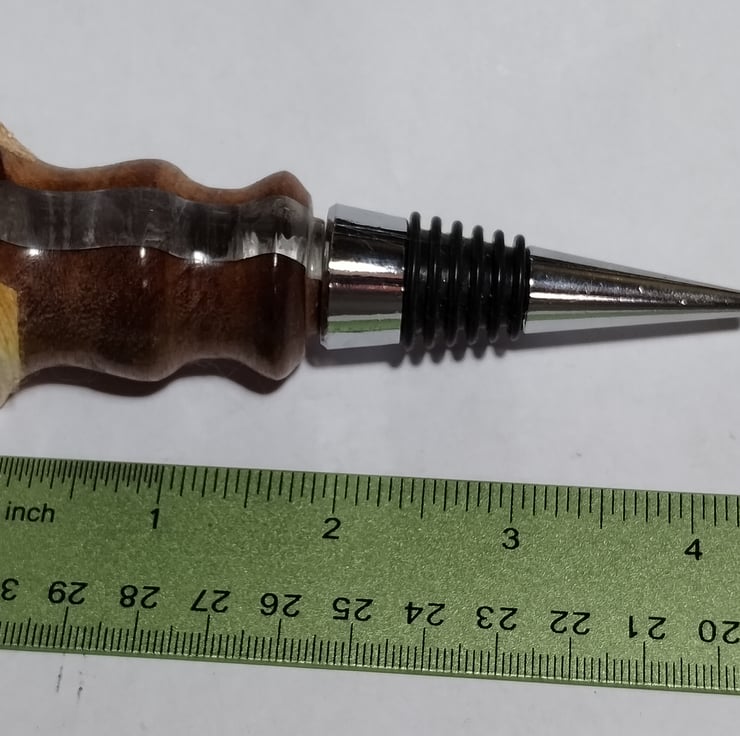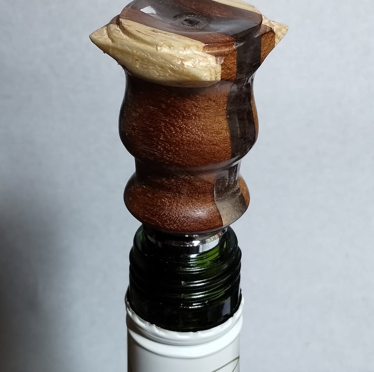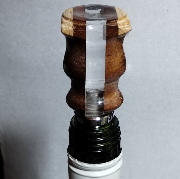 A bespoke bottle stopper, made from acrylic and timber offcuts, glued together, turned on a lathe and then polished before being connected via a screw to a stainless steel bottle sealer with a neoprene / rubber seal specially designed for a wine bottle. Each is unique and has evolved on the lathe from the shapes of the offcuts... a lovely creative process that makes each one unique. A "tap" was used to put thread in, to allow the screw connector to join them.