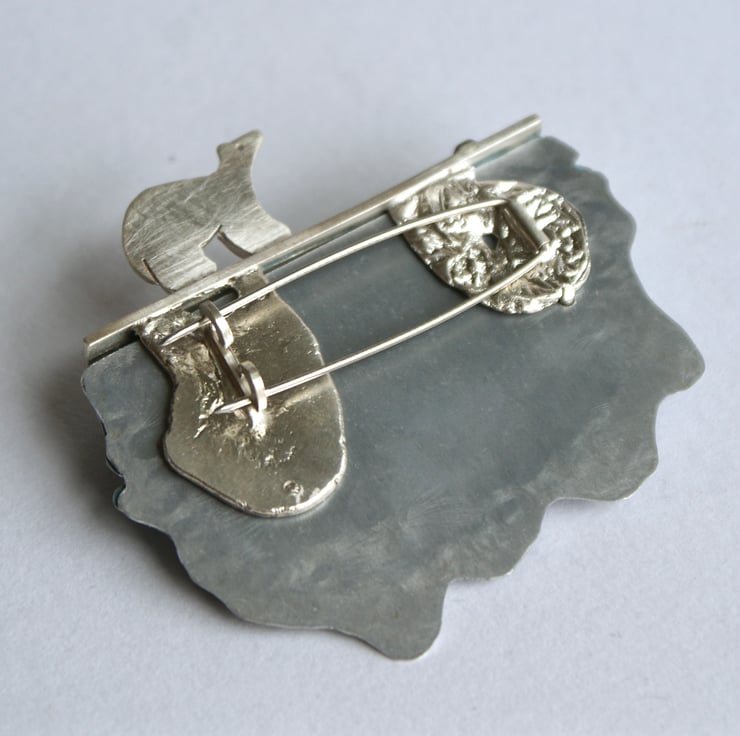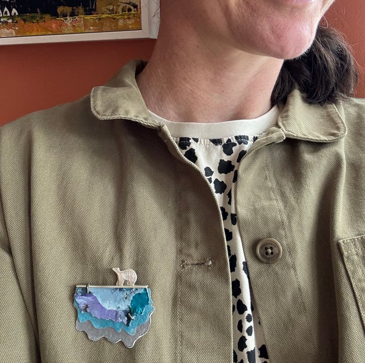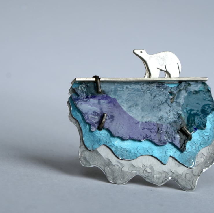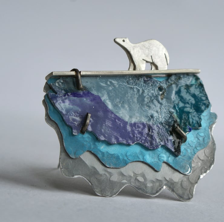 This one of a kind brooch is the outcome of my jewellery designs and painted landscapes. The brooch is constructed in layers made from sterling silver and anodised aluminium. The coloured front part is made from acrylic paint that is fixed to aluminium and varnished. . The aluminium has been hammered and textured and the 3 layers are connected to a sterling silver framework with a claw style setting. The little polar bear is soldered to the top of the framework and polished to a satin finish. The double brooch pin is made from stainless steel for extra strength.
