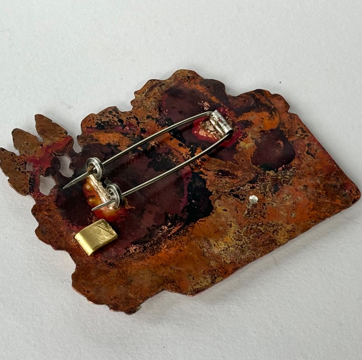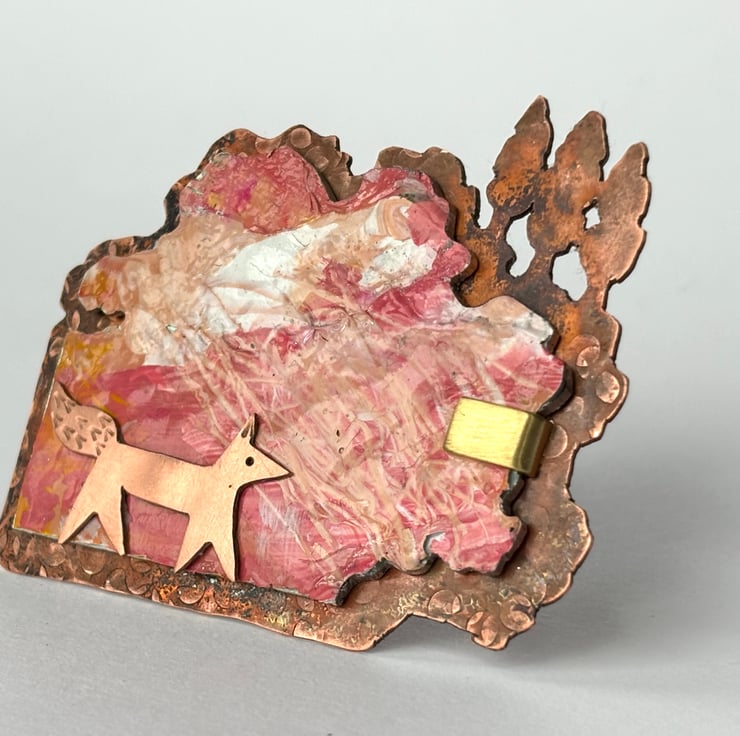 This one of a kind brooch is the outcome of my jewellery designs and painted landscapes. The coloured part is made from acrylic paint that is fixed to aluminium and varnished. This is set on a copper backing that has 3 little trees along the horizon line hand cut with my jewellers saw. The copper is oxidised from the soldering process and sealed with renaissance wax. The 2 pieces are connected with little a brass tab and copper hand cut fox. The double brooch pin is made from stainless steel for extra strength.